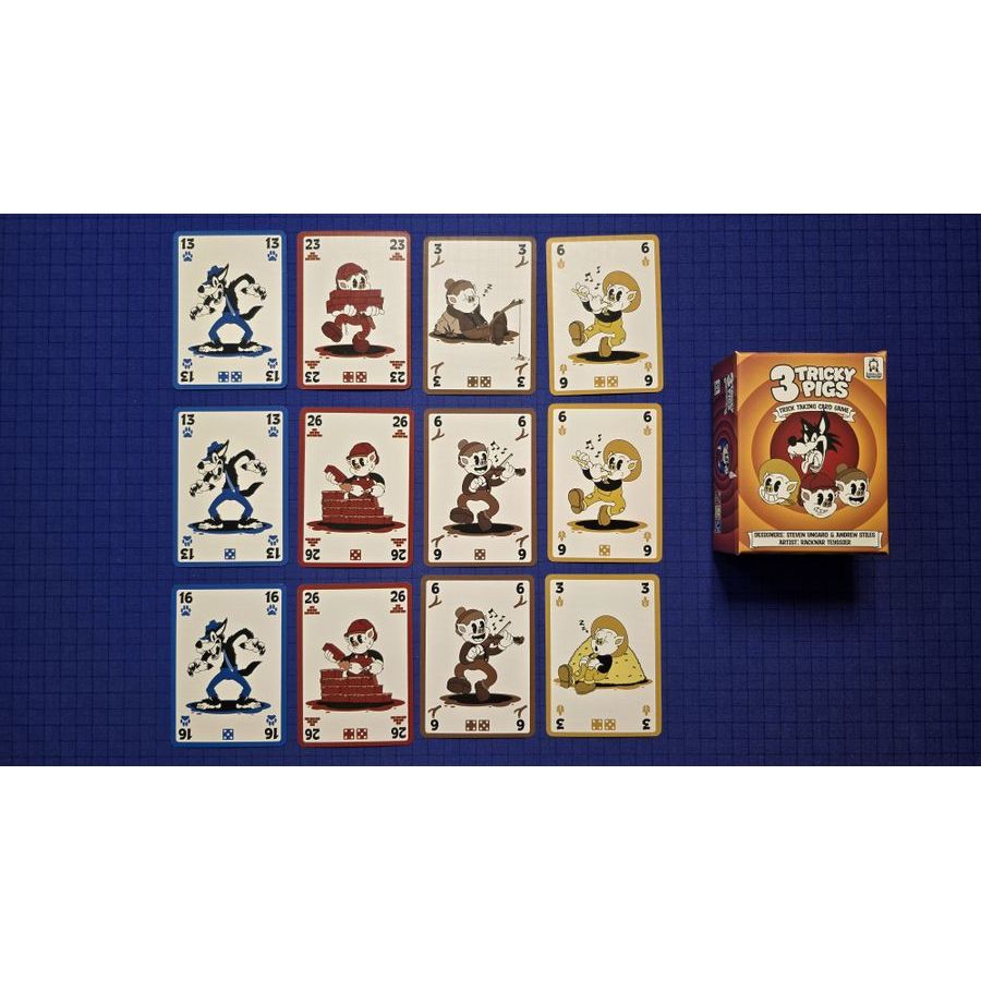 3 Tricky Pigs is a thematic trick-taking game for 3-5 players. Players take on the role of the 3 little pigs, where the laziest pig will win each trick if there is no wolf around. However, if a wolf is in the trick, the highest card will win.