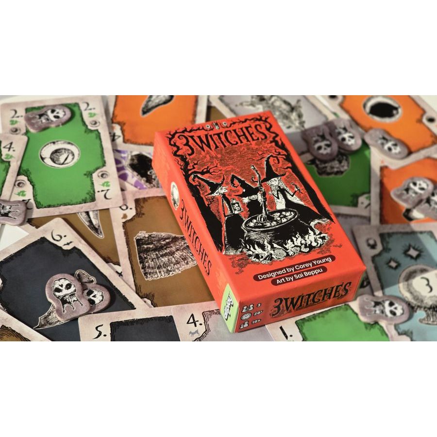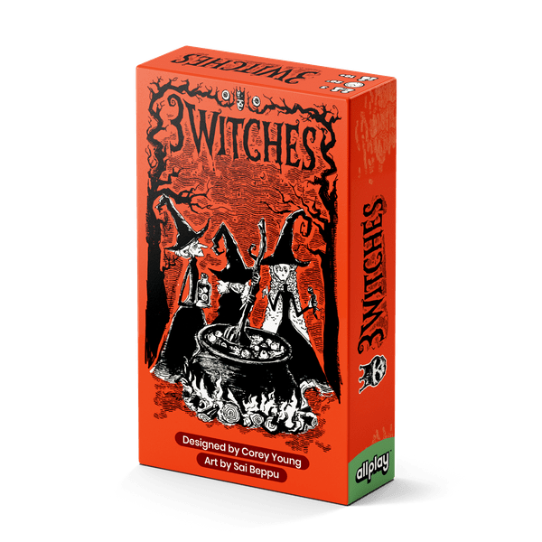 3 Witches is a must-follow, trick-taking game with no trump suit. At the start of each round, players bid on how many tricks they can win (out of five). The highest bidder becomes the Lead Witch, and their opponents play together on a team as Lesser Witches.