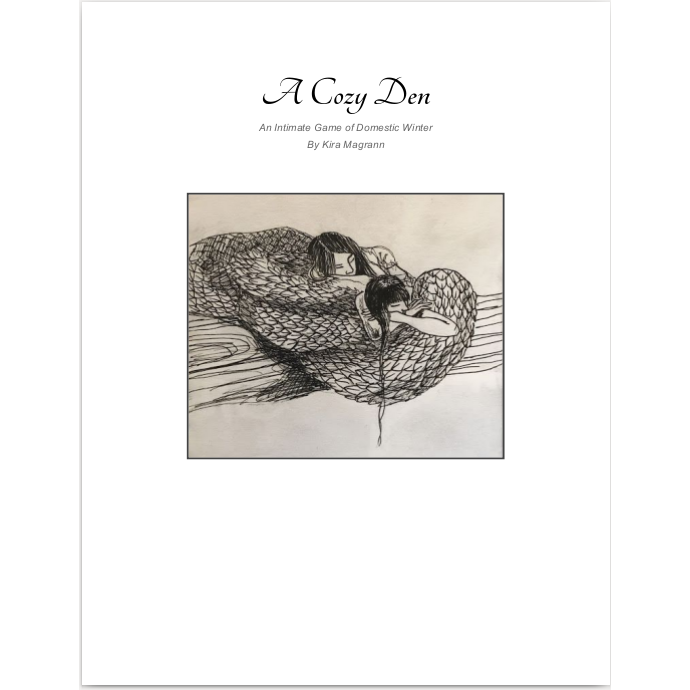 A Cozy Den is an intimate game of domestic winter. Players roleplay as Lesbisnakes who all have different needs in their Den and various ways of approaching these needs, from cuddling, to napping, to wrestling. Lesbisnakes are half snake, half human, and all lesbian. Various threats are waiting outside of the Den throughout winter putting stress on the Lesbisnakes feelings. Can the Lesbisnakes maintain a community of coziness during the overwinter time?