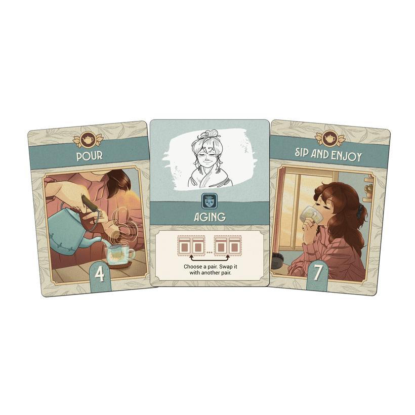 On your turn, first flip over a single face-down Worry. Then, in sequence from left to right, resolve each face-up Worry. These force you to rearrange your Tea cards in various ways, and you'll need to plan carefully to keep them from messing up your well-laid plans.