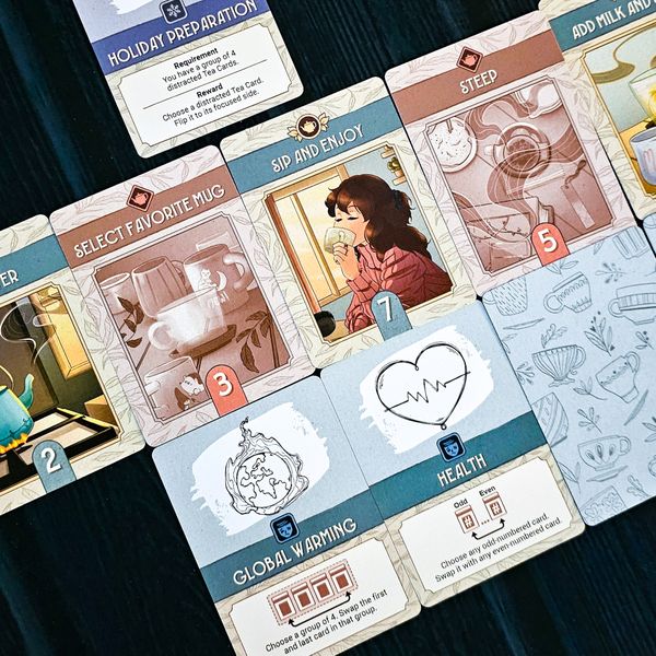 After 8 turns, your tea is ready (whether you are or not). Score points for each Tea Card you have in the correct order, plus extra points for each Tea Card with its Focused side showing. But beware that you’ll lose points for each remaining Worry.