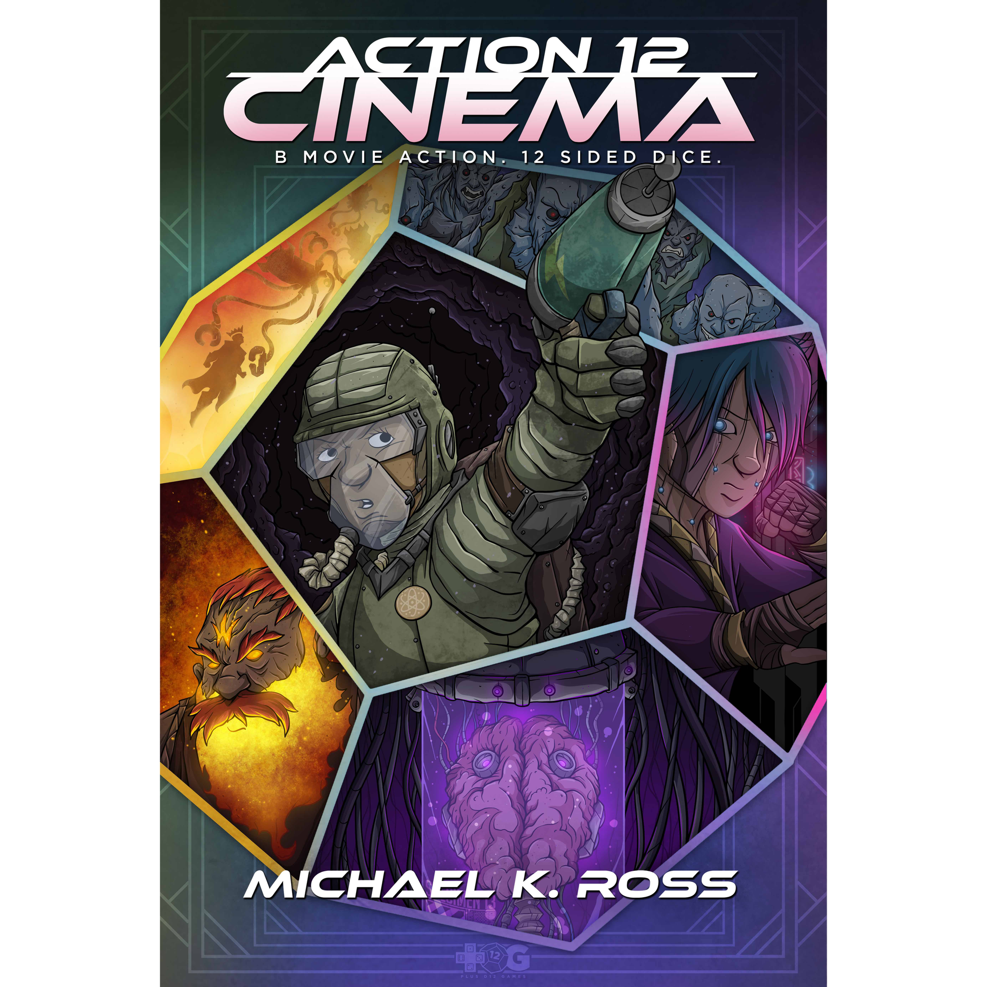 Action 12 Cinema is a GM-less, zero prep, collaborative roleplaying game for telling B-level action movie stories with handfuls of 12-sided dice. The game uses several d12 based tables along with player choices to outline a bad (but fun) B-grade action movie. Players take turns as the Active Player by setting scenes and describing actions. Whatever they say happens, happens. The game uses a simple d12 dice pool resolution system to determine if what happened helped move the scene forward. The game leans into the bad (but fun) action movie tropes allowing players to leverage common tropes for bonuses on their rolls. There is no narrative weight assigned to what's being described. So there is no difference in attacking a space vampire with a laser-steak or challenging their leader to a dance-off; winner gets the earth. Both can lead to victory, as long as the dice say so. The game works best with 3-6 players and can be played in 3-5 hours. It's designed for one-shots at conventions or maybe when your regular game isn't going to happen because of GM burnout or a missing player or similar. While you can string multiple sessions together like a film franchise there is no campaign play or character advancement built into the system. |