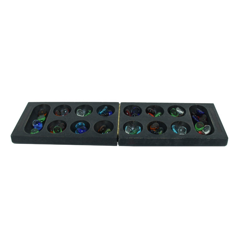 AFRICAN STONE GAME - DARK FOLDING WOOD BOARD AND GLASS STONES (MANCALA)
