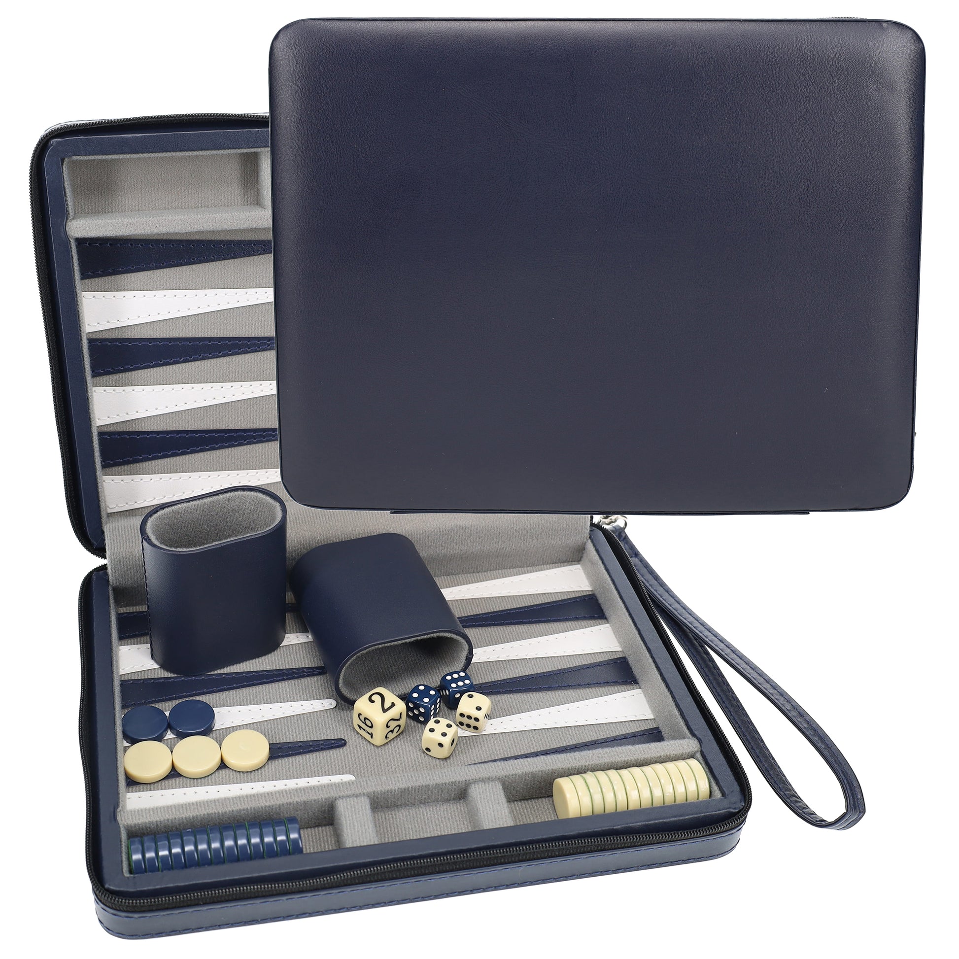 One of our most popular sets! This handsome blue backgammon set is adored for its compact size, carrying strap, and zipper closure. It is also magnetic for easy play. Makes a wonderful travel companion!