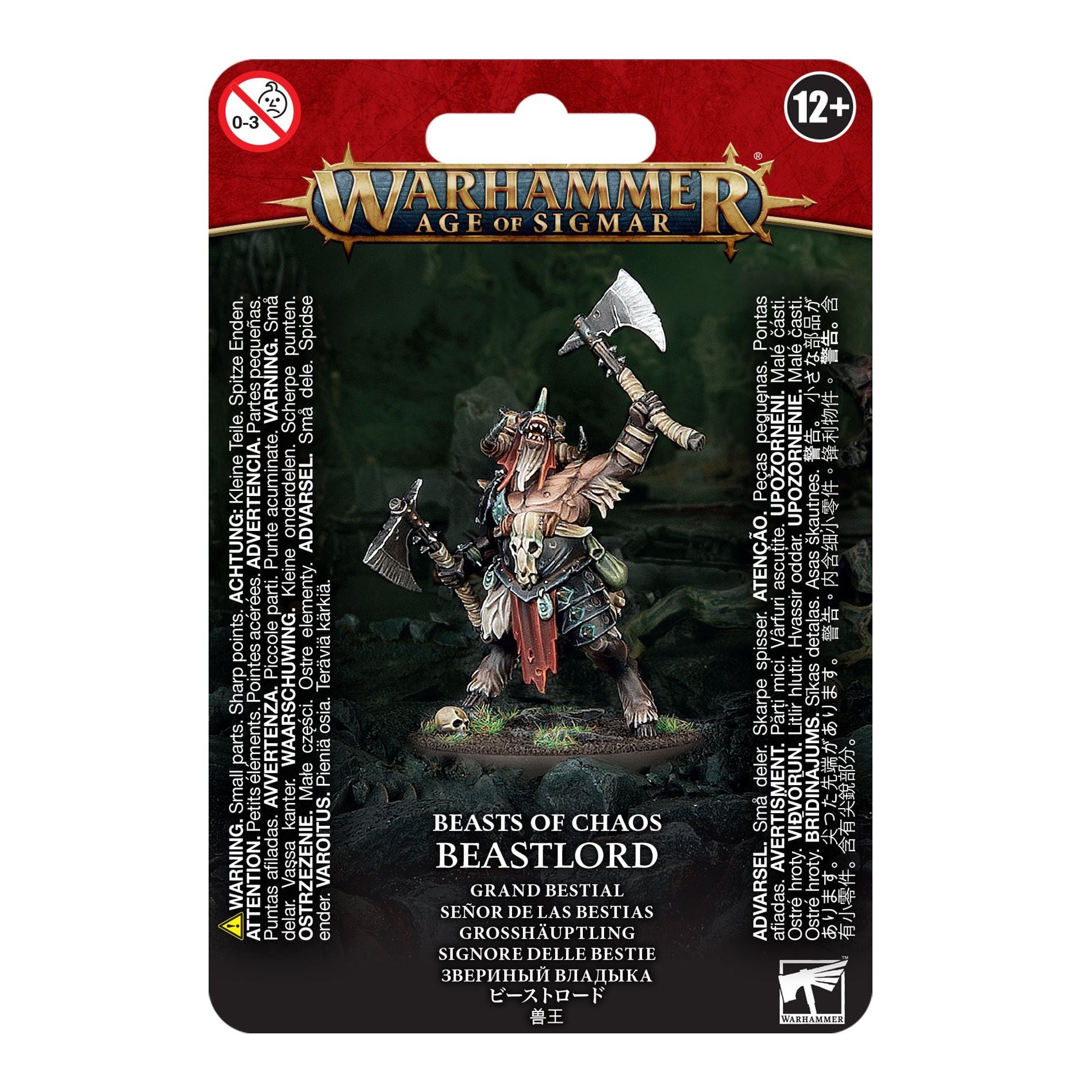 This multipart plastic kit builds a Beastlord, a fearsome chieftain of the gor-kin. Armed with a pair of man-ripper axes – just as good for ripping through orruks, aelves, and any other heroes unlucky enough to get in his way – this savage war-leader is decorated with grisly trophies claimed from his rivals. Furred, horned, and musclebound, he's posed in a bellowing call to battle, extolling the pure savagery and might of the Beasts of Chaos.