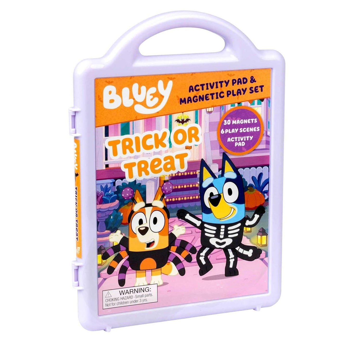 Bluey and her sister Bingo are so excited for Halloween! The spooky fun is never done in this play case with an activity pad full of mazes, coloring, and more. Pick Bluey and Bingo’s costumes, fill their house with spooky decorations, pick your favorite Halloween candy, and so much more. Young Bluey fans can use the 30 magnets to decorate the 6 play scenes for extended fun in this interactive format!