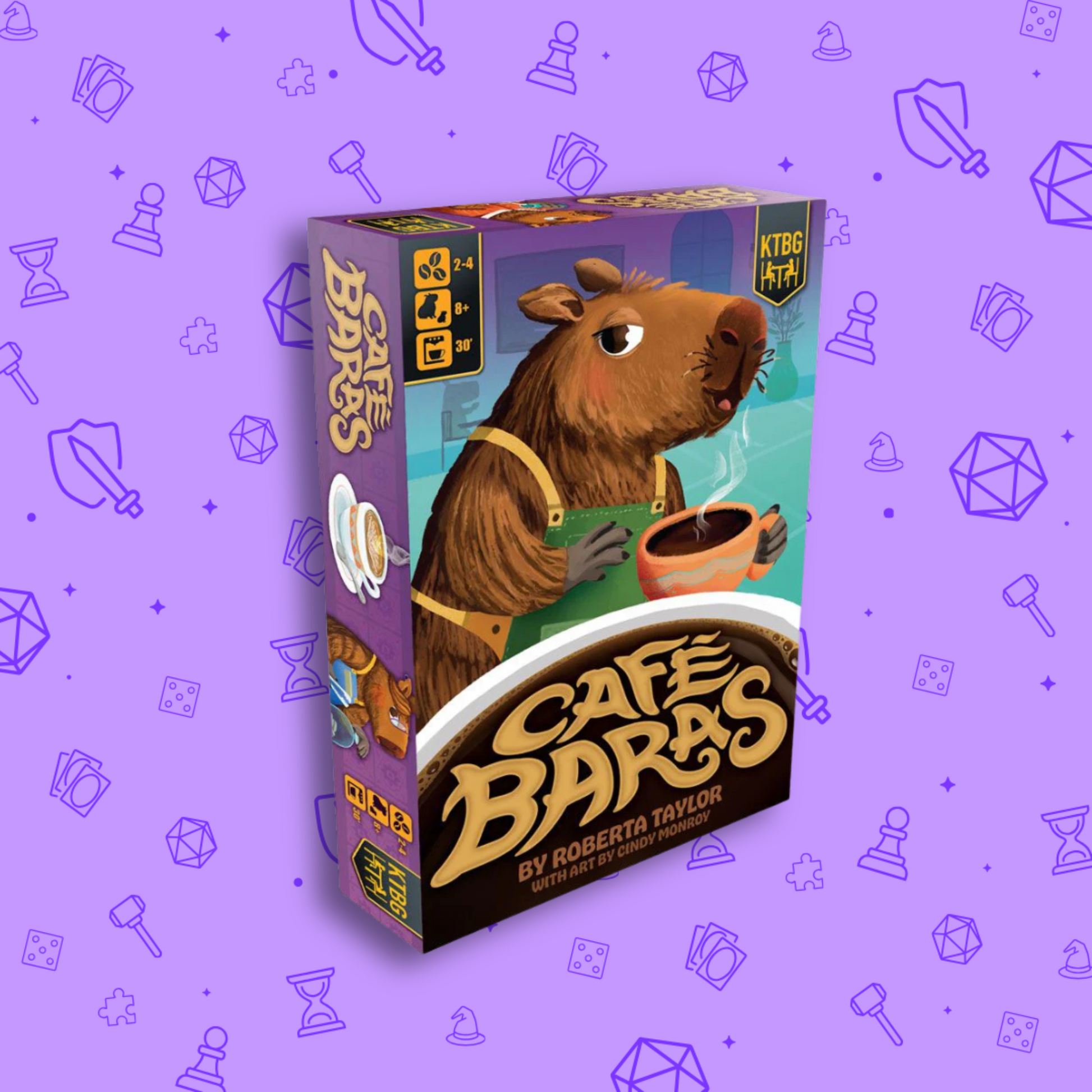 Café Baras is a card drafting, tableau-building game brought to you by the creative team behind the critter classics Creature Comforts and Maple Valley. Designed by Roberta Taylor and featuring illustrations by Cindy Monroy, it plays 2-4 baristas in about 30 minutes.