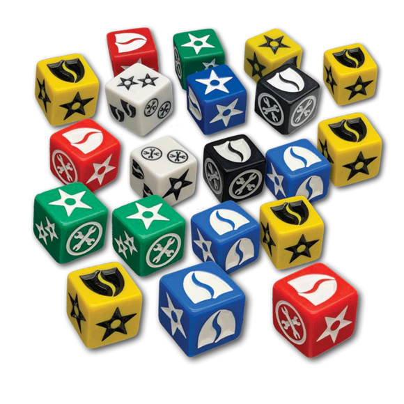 Twenty custom six-sided dice – use them for attack rolls, defensive rolls, and movement rolls! You can never have too many dice. . .