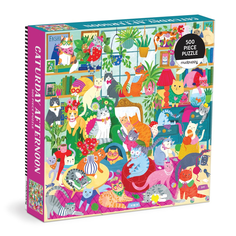The Caturday Afternoon 500 Piece Family Puzzle by Mudpuppy features feline friends having made themselves quite cozy in a colorful living room scene! In every inch of this puzzle, there are tons of quirky details to discover. Perfect for families who love animals and spending time together.