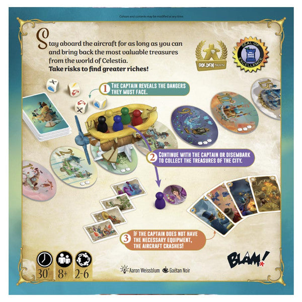 Aboard an aircraft, explore the cities of Celestia in search of their treasures. At each turn, a new captain must face the adventures of the journey: will you trust him/her to reach the next city? The further you go, the more fabulous treasures you’ll be able to recover… unless the aircraft crashes! A clever push your luck game in a dreamlike world.