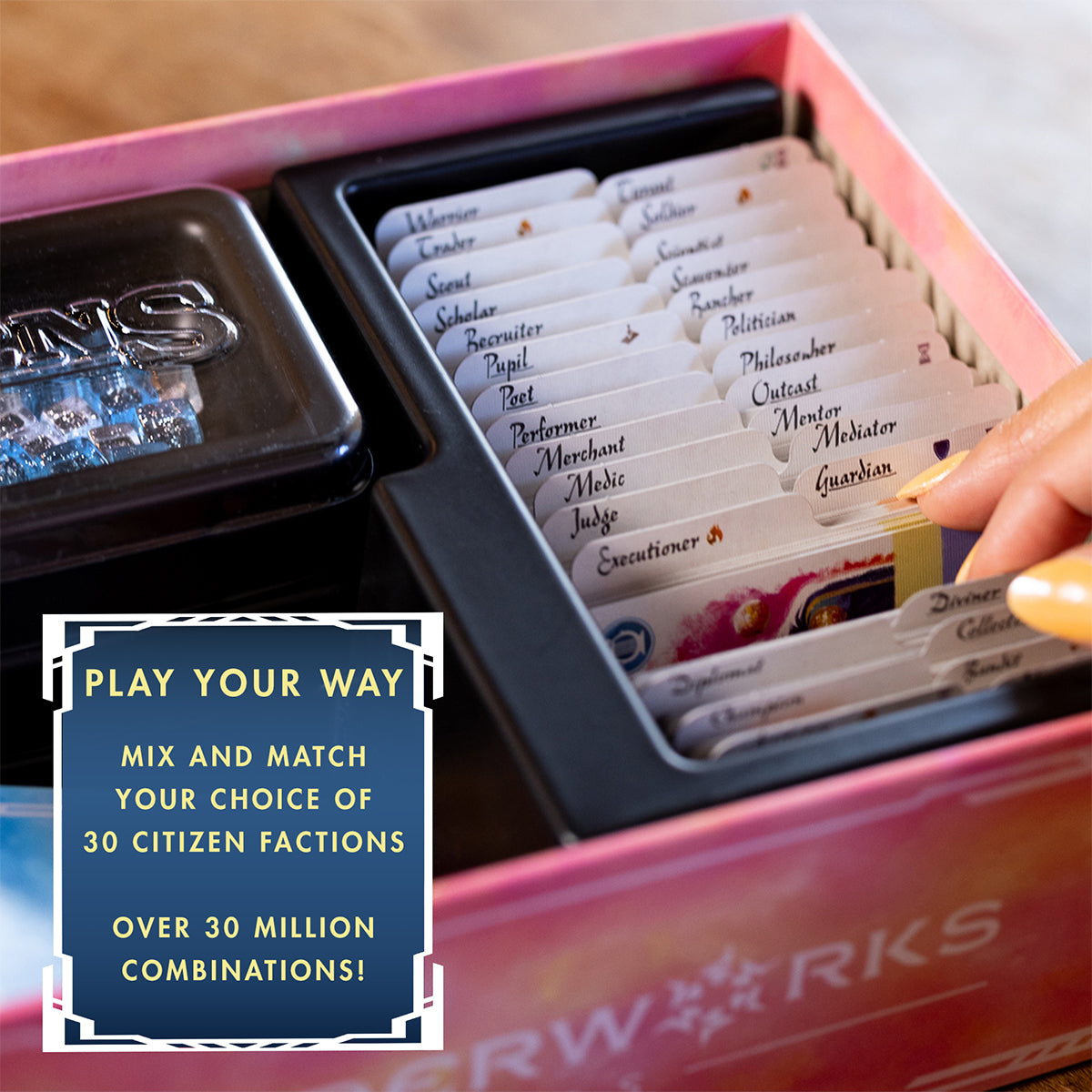On your turn, recruit multiple citizens by selecting an available group of cards, placing them in your city tableau, and grouping like citizens together to grow their action strength. Next, select one type of citizen in your tableau to activate, taking the effect of the card and discarding it from your city. But keep watch on rival cities, because when you activate a citizen, all players can follow your move and activate a matching citizen of their own!