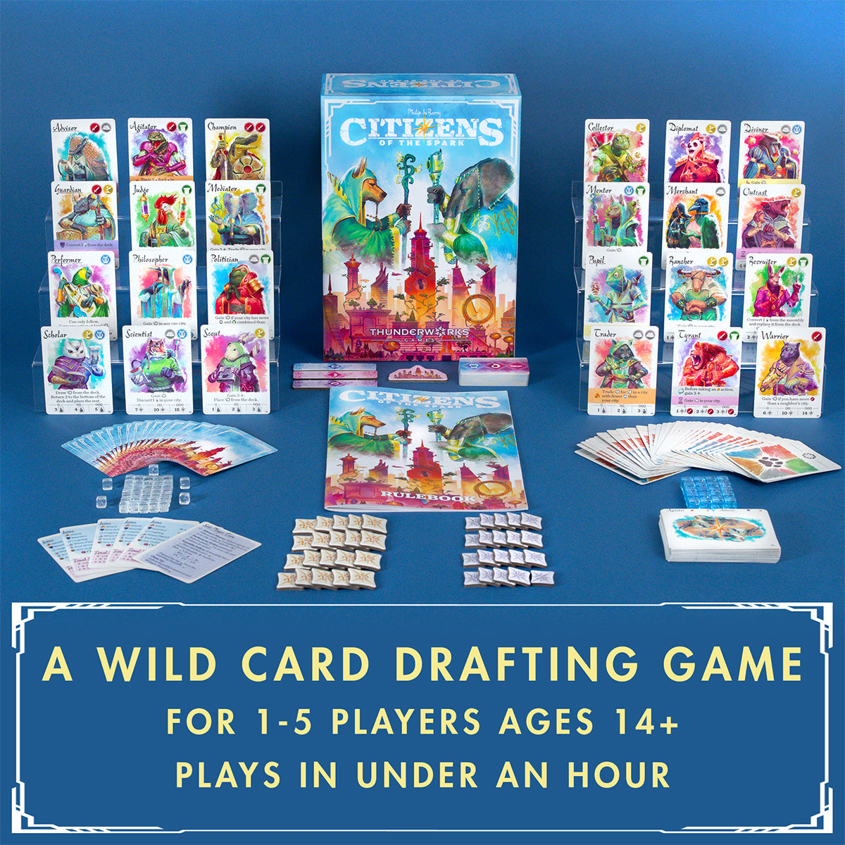 Citizens of the Spark is a variable set-up card game in which players take turns attracting citizens, taking actions, and claiming sparks. The more citizen cards a player has of a specific type, the more powerful that citizen's action becomes. The player with the most sparks in their city when the deck runs out wins!
