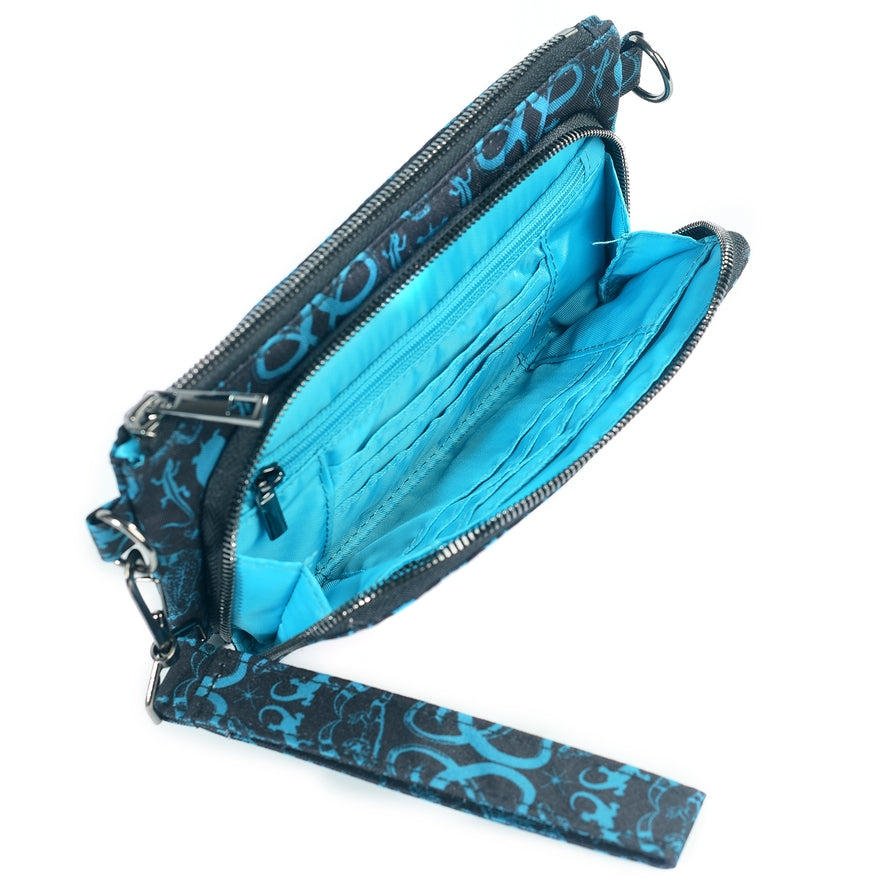 Ignite your love for the cold blooded with this unique pattern featuring alligators, snakes, crocodiles, iguanas and lizards alongside some of their favorite snacks. The wallet compartment includes 6 designated card slots, a zipper change compartment and a cash or receipts sleeve. The larger zippered compartment fits a passport and most smart phones.