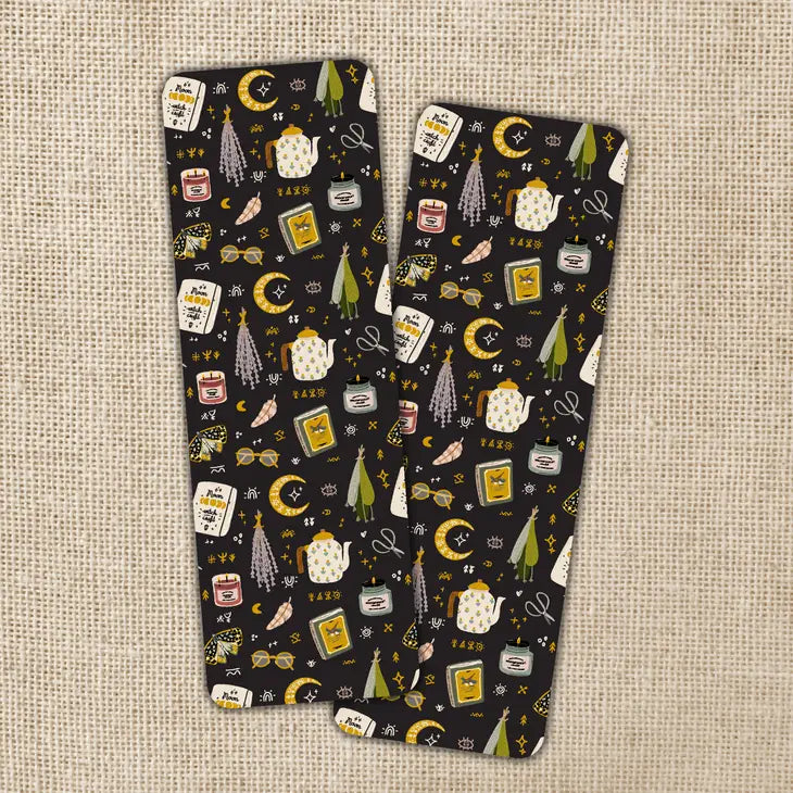 Magical accessories patterned bookmark with spell book, herbs, butterfly, tea, and more.