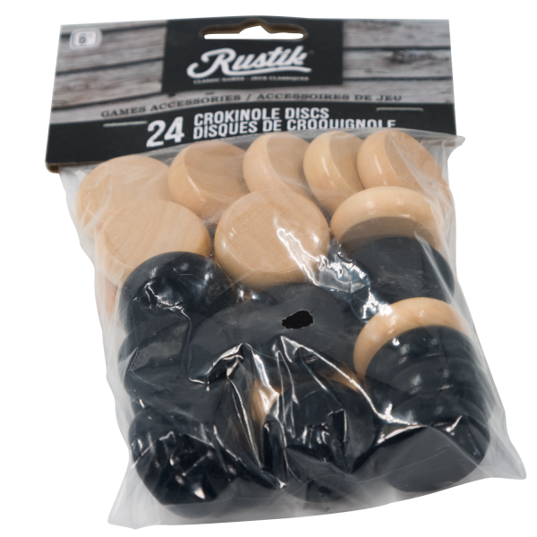 Set of 24 crokinole chips - 12 wooden light discs and 12 wooden black discs.