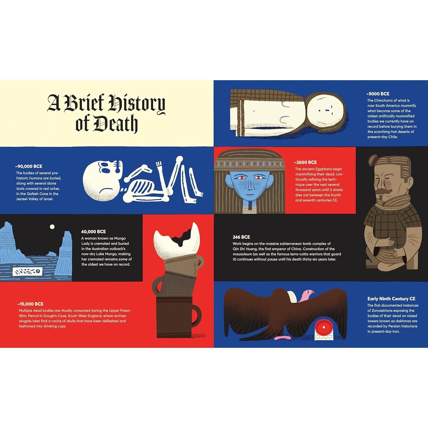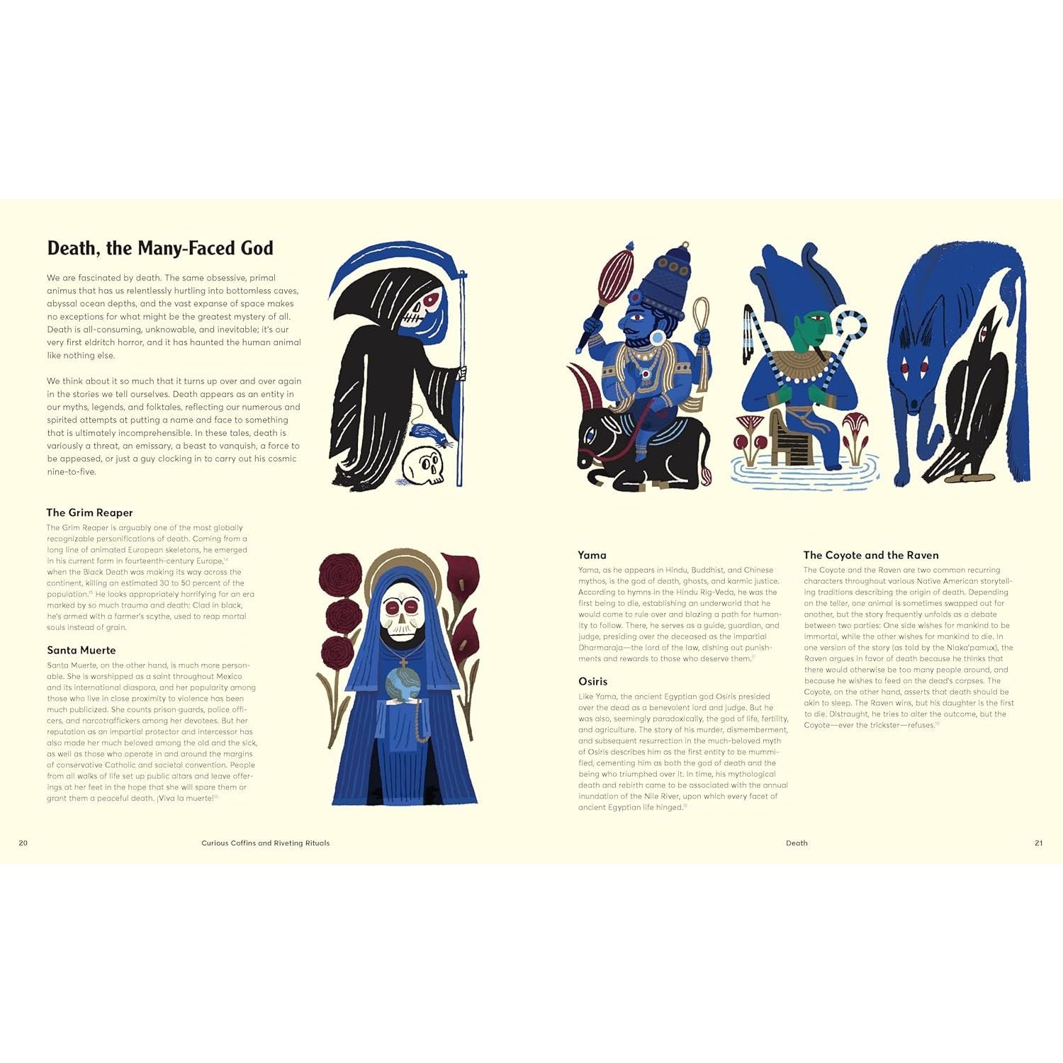MARVELOUSLY MACABRE, TREMENDOUSLY THOUGHTFUL: Dynamic, full-color artwork accompanies informative and intriguing text, rendering everything in energetic detail—from a step-by-step breakdown of the embalming process to detailed diagrams of ancestral altars around the world.