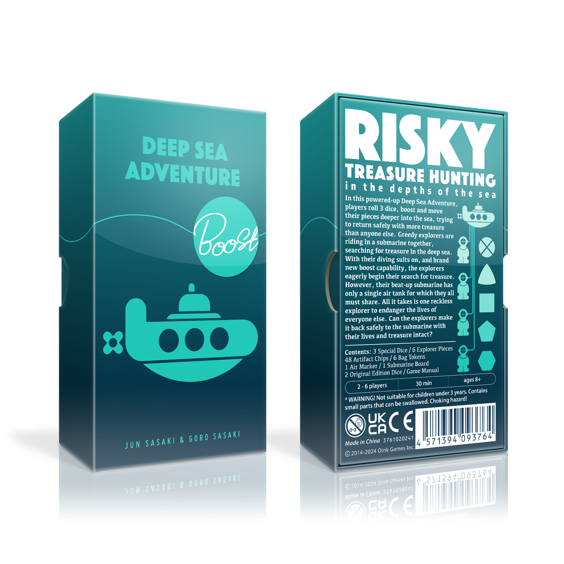 Deep Sea Adventure Boost features the same gameplay and components as Deep Sea Adventure, but it adds three new dice for a new way to play. These dice feature the digits 0 & 3, 1 & 3, and 1 & 2. When you roll, you now roll these three dice, then choose two of them to determine your movement, although you still subtract points for the treasure you hold.