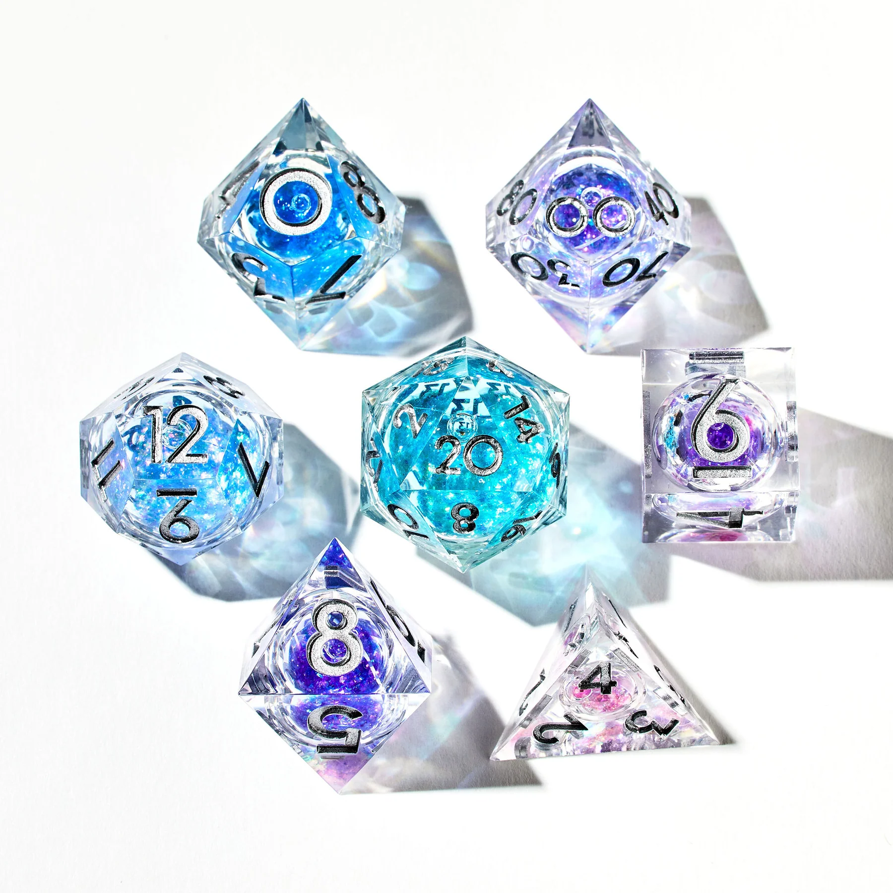 The Mystic Tides 7-Piece Liquid Core Dice set features an array of cool shaded dice each with their own uniquely colored core. Each piece is encased in a crystal clear resin base with silver inked numbers which compliment each face.
