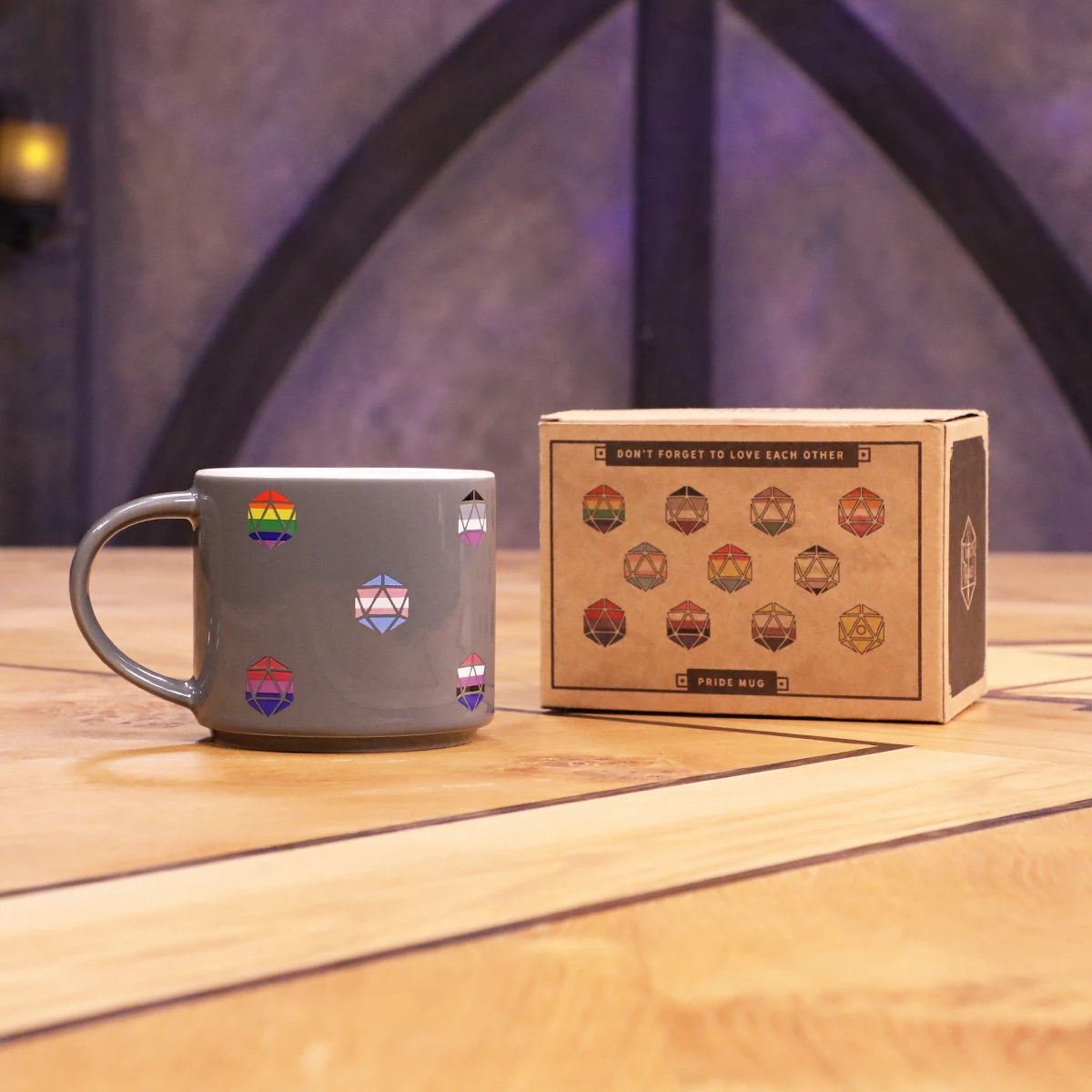 This gray 14 oz mug features 11 pride flags from across the LGBTQIA+ community. The bottom of the inside of the mug showcases the phrase, “Don’t Forget to Love Each Other,” the favored send-off of Brian W. Foster.