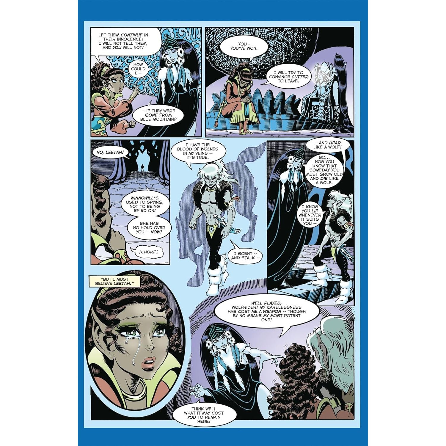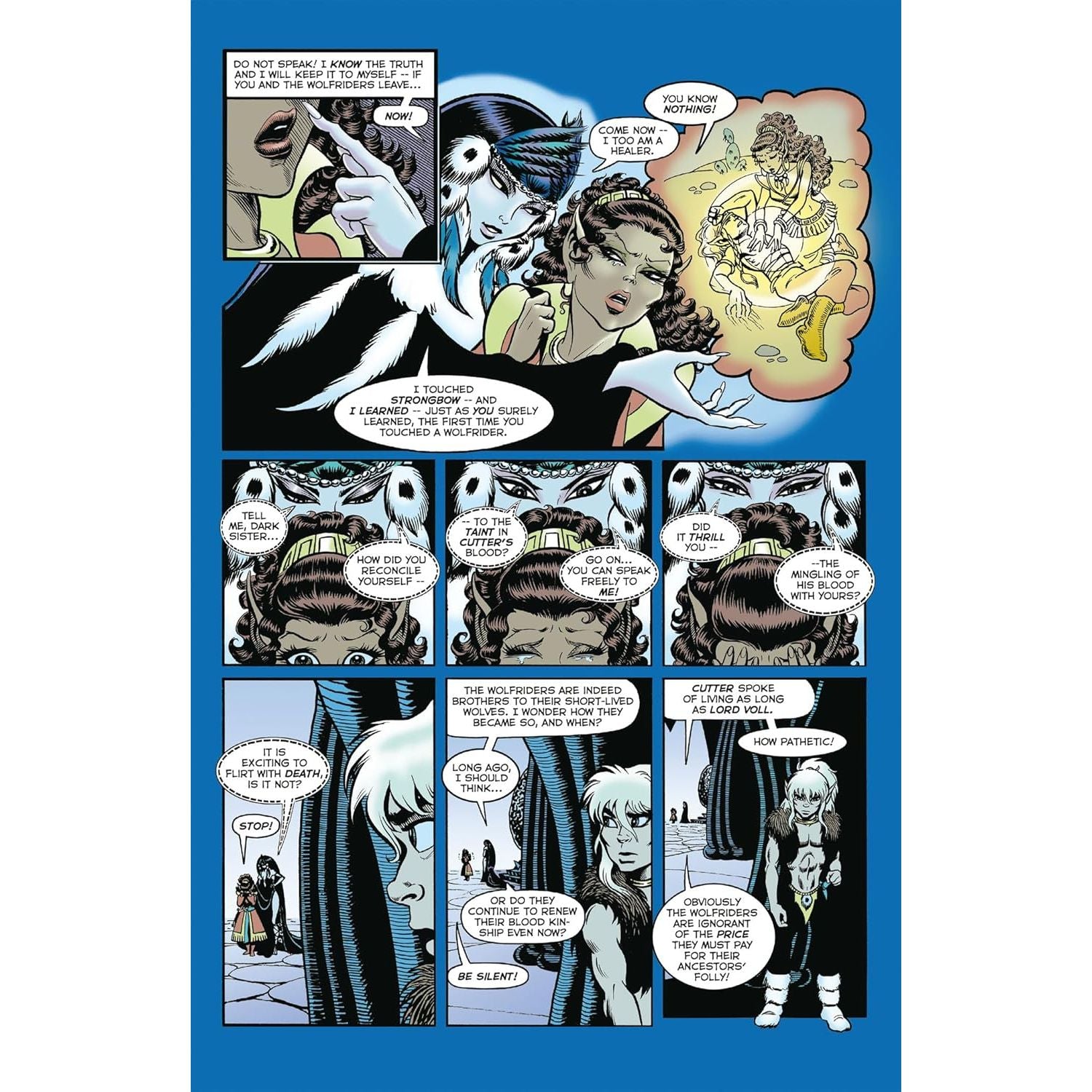 With these words Cutter and Skywise imagine their quest to find other elfin allies may be close to completion. The companions have no idea their hopes will be upended. For imperious Lord Voll rules Blue Mountain and the hawk-riding elves who dwell within, and he wishes no intrusion upon his Gliders’ isolated way of life. Yet even Voll’s resistance pales before the hostility of the true power in Blue Mountain—treacherous, seductive Winnowill. Shape-shifter, pain-giver, she will stop at nothing to prevent the Wolfriders from threatening her invisible hold on the Gliders.