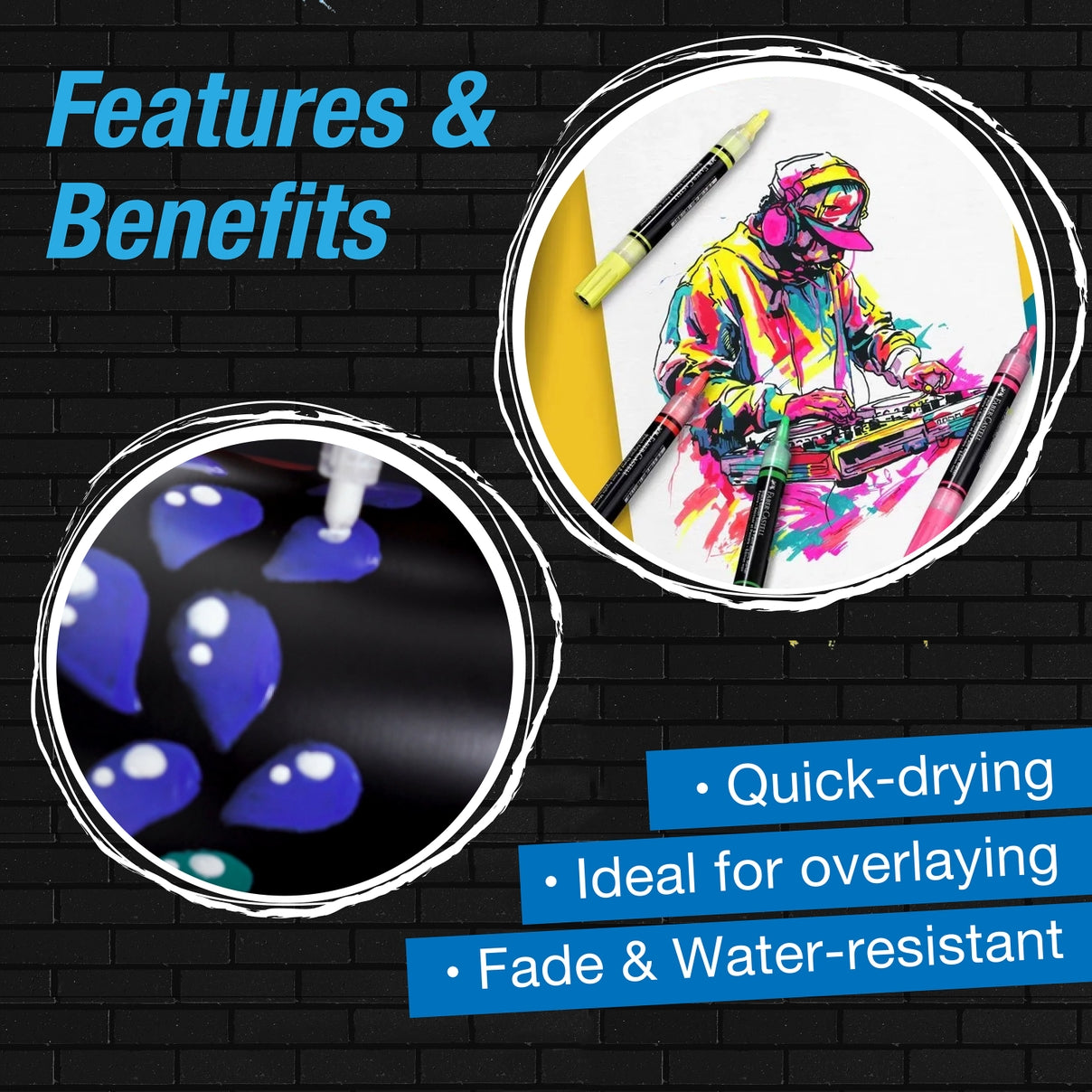 Black Edition Shake & Paint Acrylic Paint Markers with vibrant colors are dual nibs are the ultimate tool for creating vibrant, permanent designs on almost any surface.