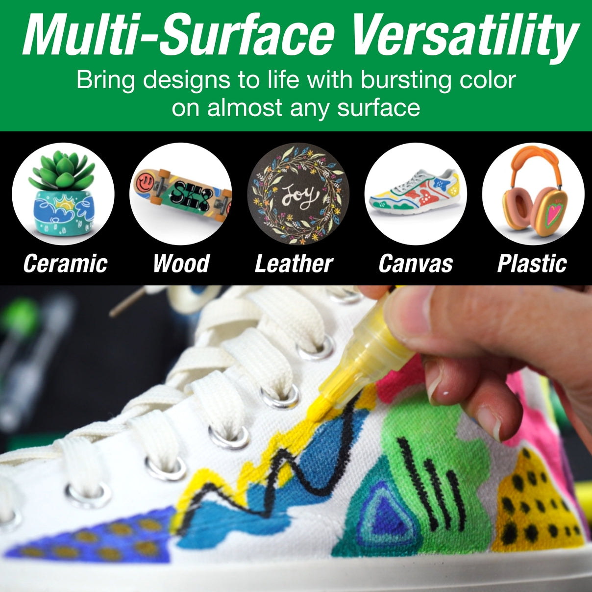 Works on a variety of surfaces: acrylic, plastic, glass, metal, leather, wood, canvas and paper with vibrant, permanent results. Enjoy rich, opaque colors that deliver professional results every time, whether you're creating fine art, decorating objects, or personalizing gifts.