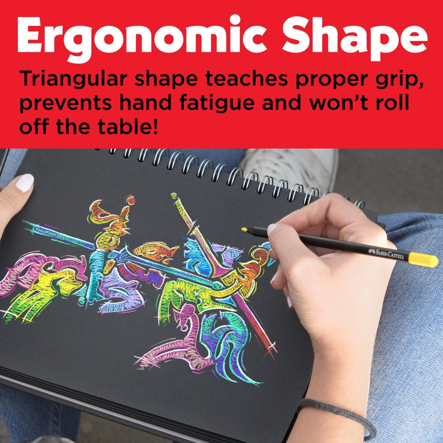 The ergonomic triangular shape of the pencils automatically ensures the correct grip position for optimum comfort while drawing and prevents hand fatigue when creating art. Pencils will not roll away from the work surface as well. The pre-sharpened pencils have a color-dipped end to match the lead, for easy identification when working between colors.