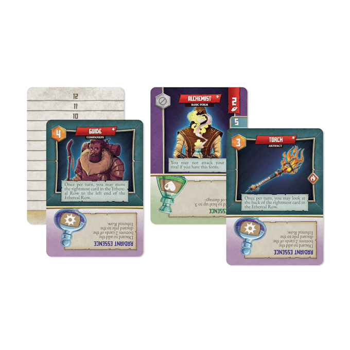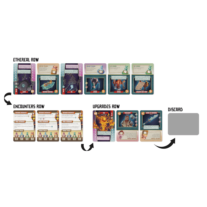 Next the player may buy and sell any Essences from the Ethereal row and spend whatever wealth they have on Upgrades. Artifacts and Companions add powerful abilities and increased damage against the Rival. Forms offer a bit of both, and are necessary to face the Rival.