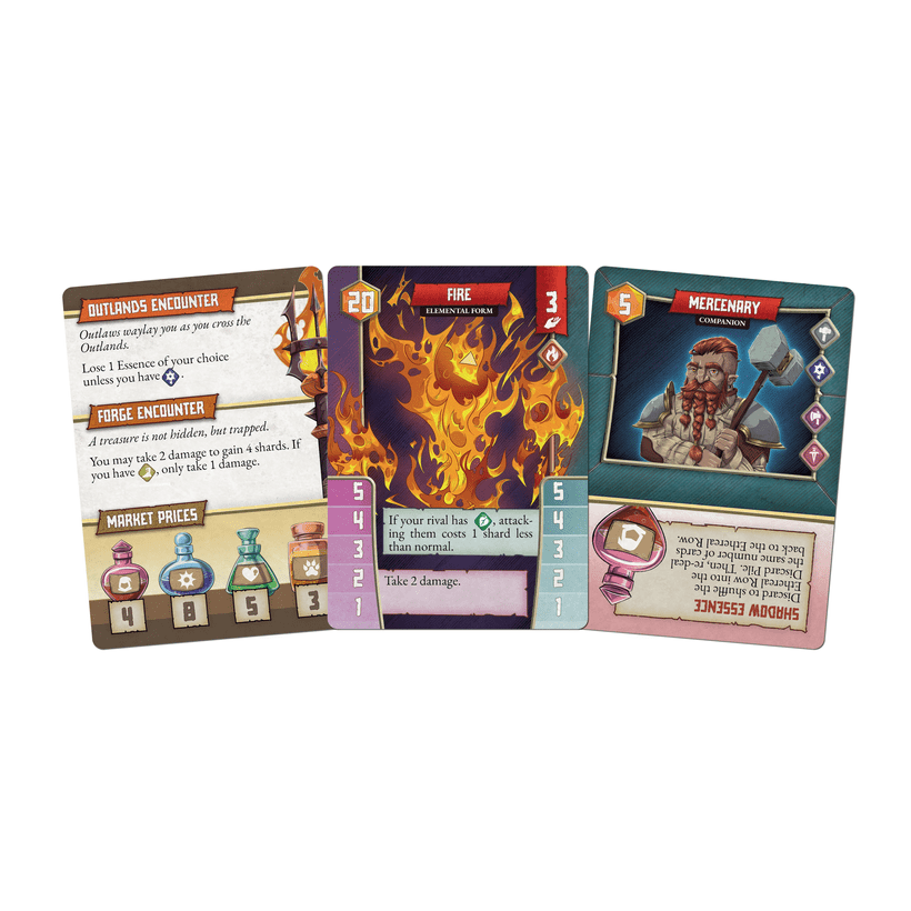 Each turn advances the clock, bringing the player into direct conflict with their Rival. Once the Ethereal Row begins to run out of cards, the Rival acts either by gaining an elemental Form or by dealing damage. If the player’s character survives this initial strike, they may spend Shards to deal damage in return. Damage inflicted persists if the Rival is not defeated, but there are only so many chances to win: each time the Rival acts, they tick down the number of actions they have remaining. The player must deal sufficient damage to the Rival before they use their last action to secure victory!
