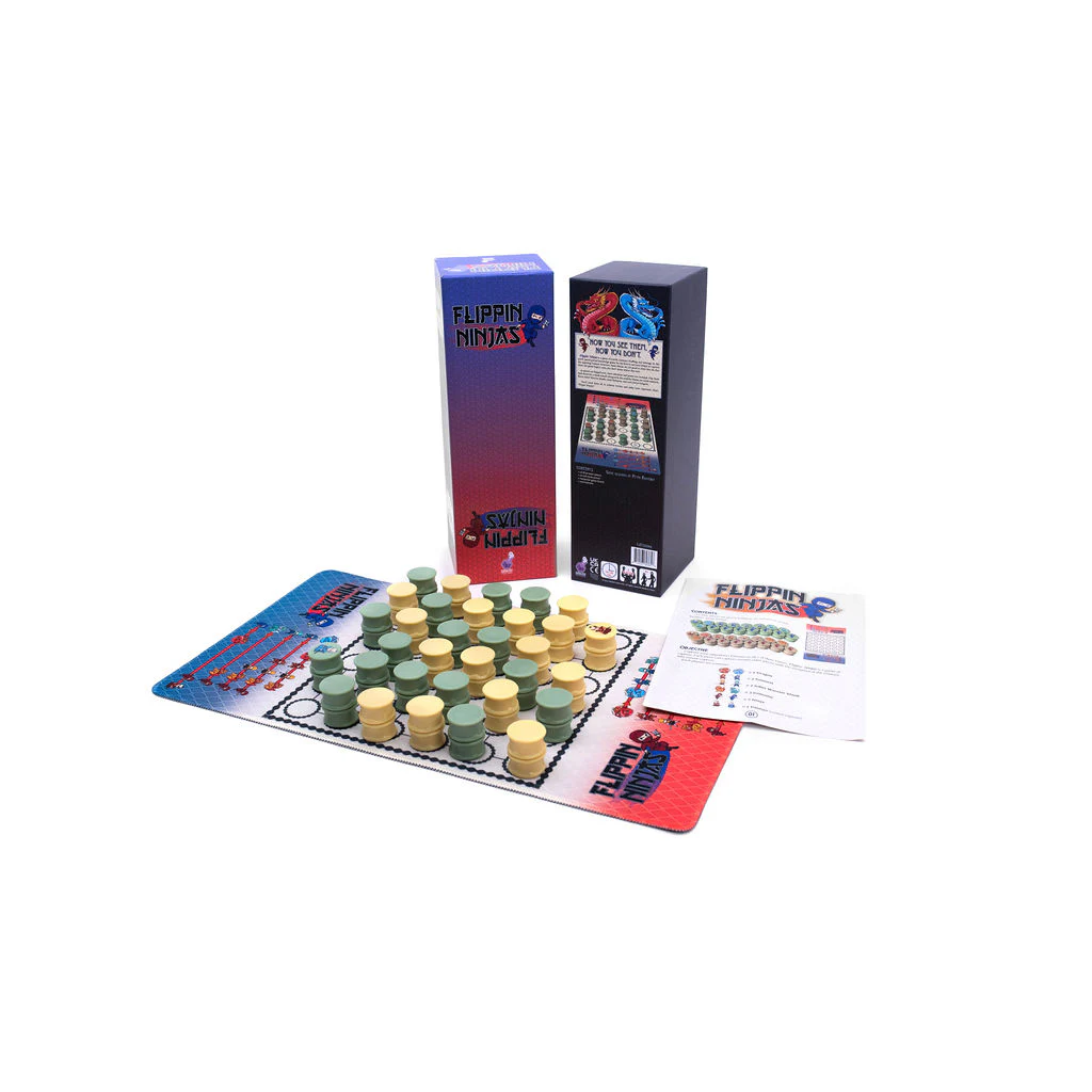 Flippin' Ninjas is a game of stealth, memory, bluffing, and strategy. In this quick-paced hidden knowledge game, be the first to use your Ninjas to capture the opposing Daimyo. However, these Ninjas are SO good at what they do that when the game begins, even you don't know where they are! As pieces are flipped over, their identities and power are revealed. Flip them back down for a sneak attack! Along with stealthy Ninjas are noble Samurai, fierce Sohei Warrior Monks, loyal Komainu and even fierce Dragons. You'll need them all to achieve victory and make your opponent shout, "Flippin' Ninjas!"