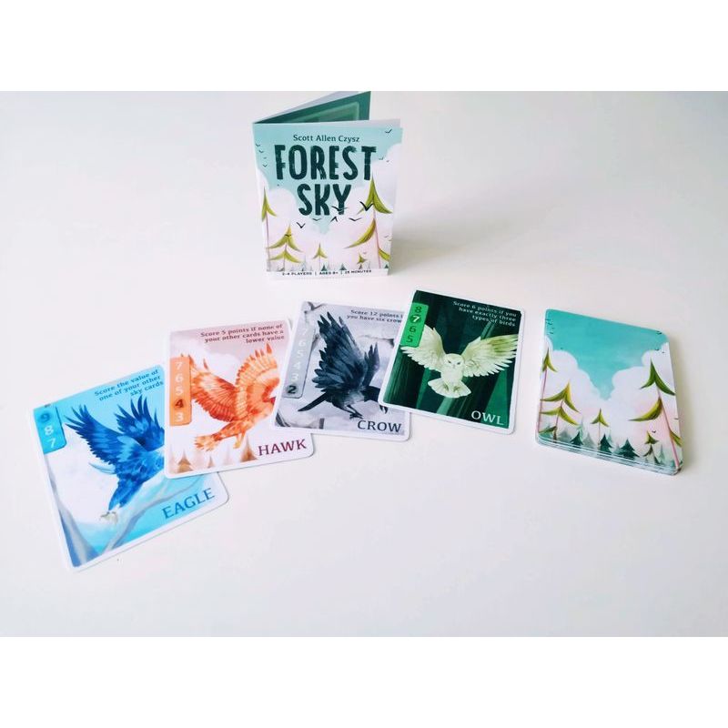 Forest Sky is an 18-card hand management game where 2-4 players compete for the best 6-card scoring combination. Each card features a unique scoring rule, with players using both the 3 cards in their hand (“the sky”) and one of the shared card pools in play (“the “forest”) for final scoring. As players draw cards, they’ll fill the forests and shape the skies in their favor to win the game.