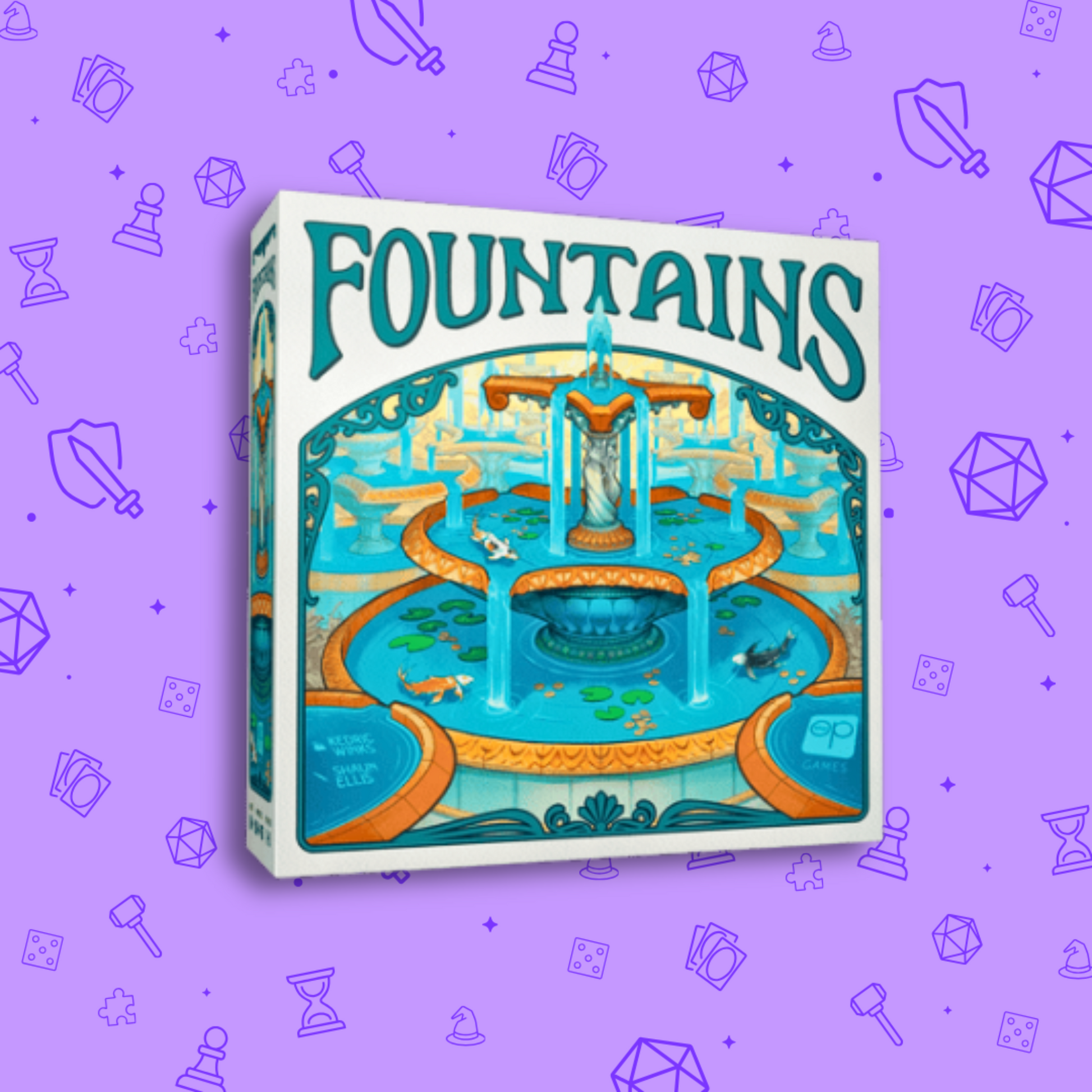 Fountains is a take-and-make game in which each player starts with a round fountain that features a spout and room for four features.