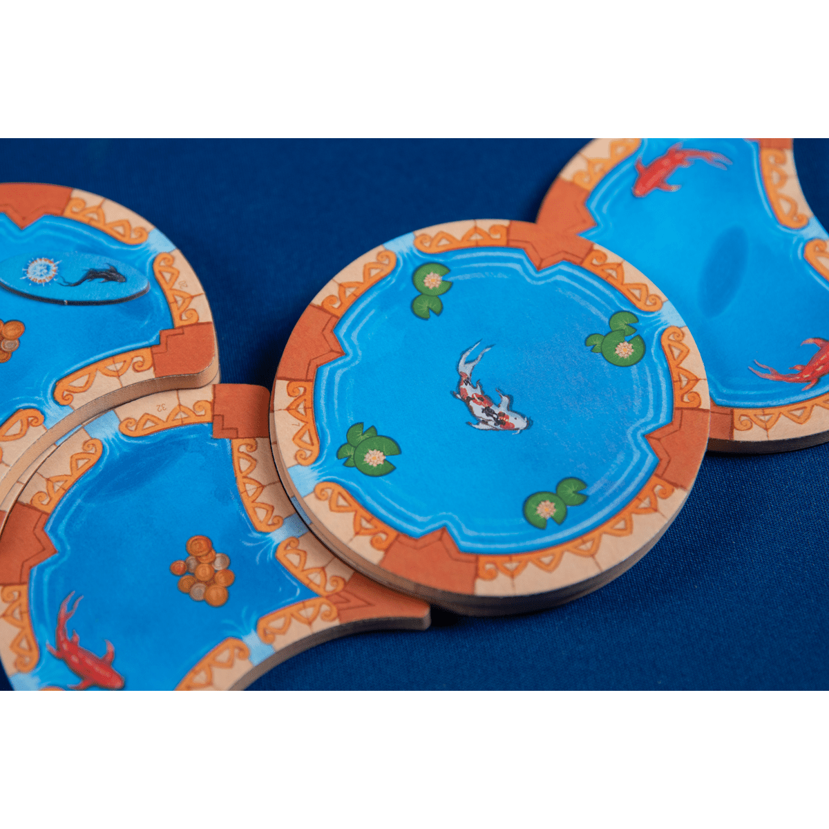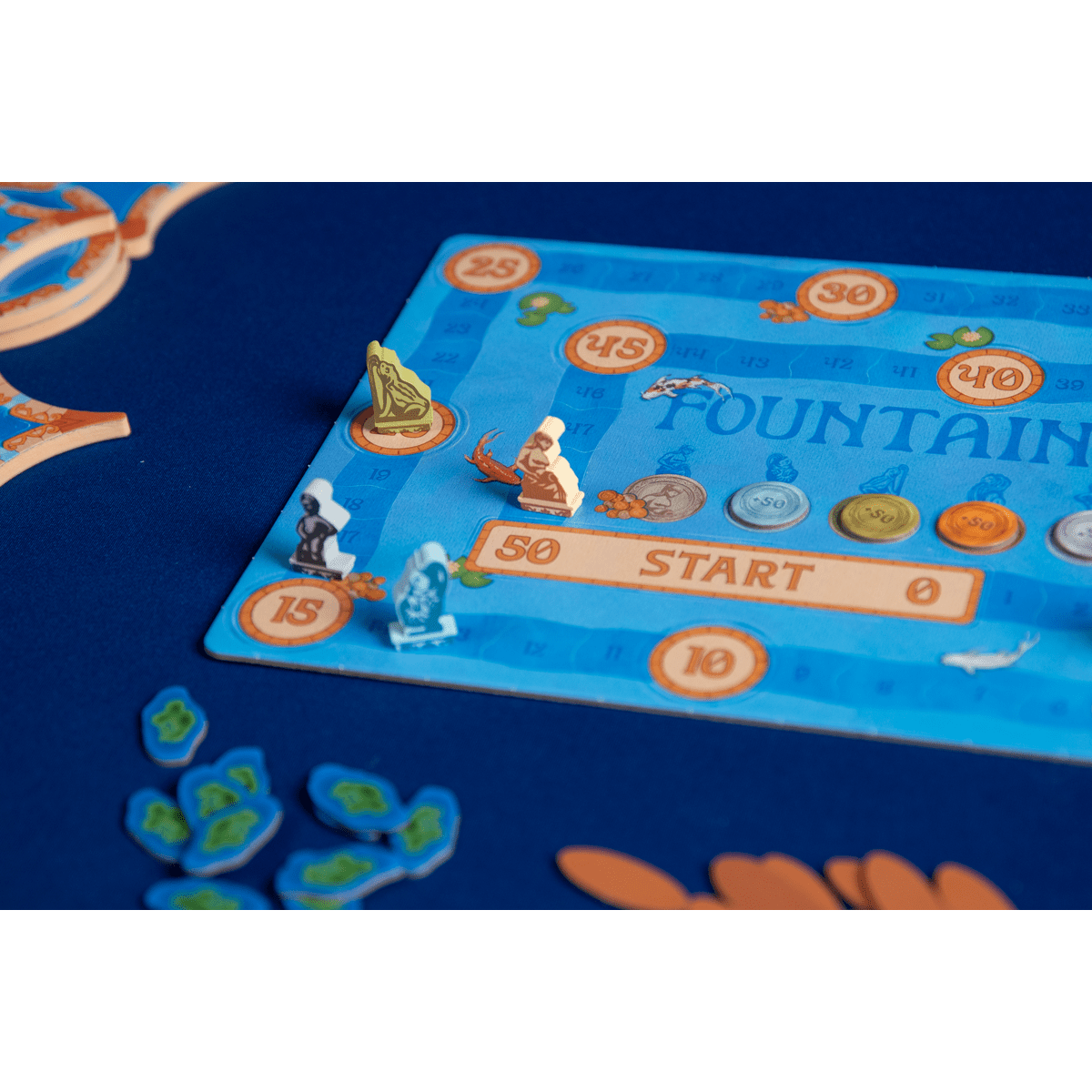 When someone lands on the green, blue, or white space with the matching colored token, everyone scores for the linked item: lilypads, separate pools linked by constant water flow, and fish. (Fish come in three types, and the player who scores fish chooses which color scores.) For each item, you score 1, 2, 3, etc. points if the item is on the first, second, third, etc. level.