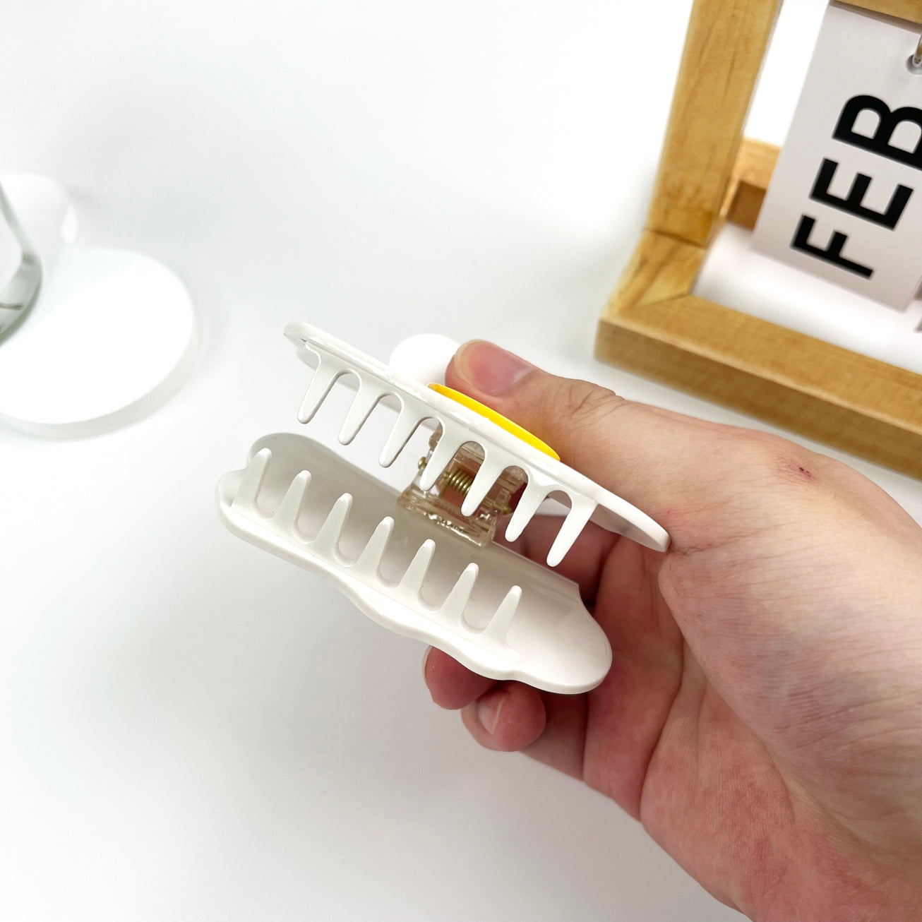 What better way to contain your hair than with a funky hair clip! This big fried egg hair claw is just what you need to tame that mane. Made of acetate and measures 3" long by 2" high.