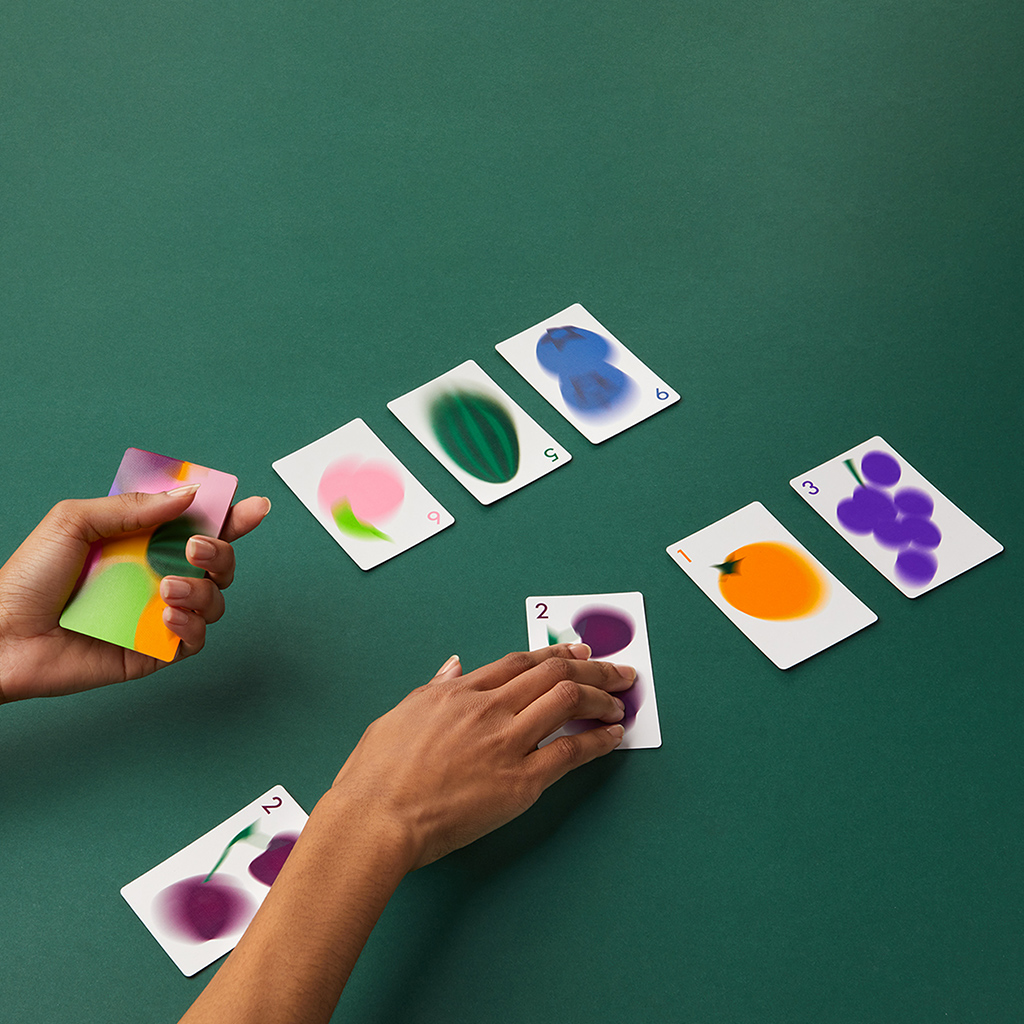 Fruit Fight is a game about pushing your luck and stealing your friends and family's fruits. If you draw fruit cards that match what other players are about to score, you get to steal them all. But be careful: if you draw a fruit you already have, you bust!