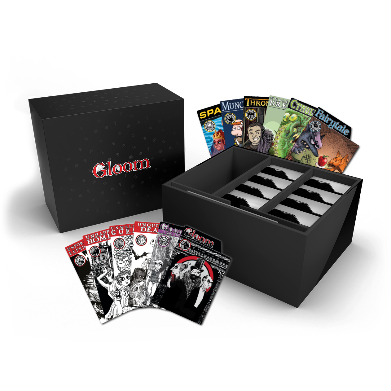 Gloom fans have been asking for it for years, and it’s finally here … a box big enough for ALL your Gloom games! This luxurious case holds every Gloom game — roughly 1500 cards — plus all your rules and extras, as well as your darkest secrets. It even has room for future releases.