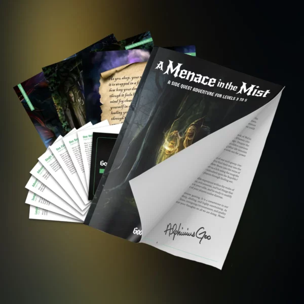 Deviate from the path and get pulled into an adventure in the Myrewood, a fearsome forest. This adventure will begin in the town of Prondadol, within which the Player Characters will be greeted by a sense of disarray. Rumors of disappearances flood the streets and public establishments, and townsfolk seem less willing to walk the roads at night. While wandering the town, Player Characters will see more than a few notices posted on every street from families, loved ones, and town officials announcing missing persons and offering rewards for information that might lead to their finding. As the PCs investigate, they will find themselves trapped in the Myrewood, stymied as they attempt to find a way through the mists. Mists in which deadly enemies weave their dark plots…