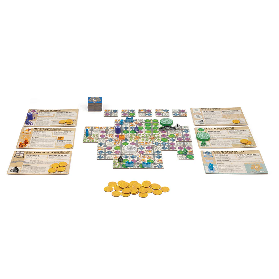 In the world of Dragoria, the realm of Thornshire lies in chaos. A horde of ancient dragons have devastated the land, reducing cities and towns to smouldering ruins. Survivors have retreated into caves, waiting for the chance to rebuild their lives. Thornshire’s Queen has issued a royal decree: the Guilds must restore the realm and surpass its former glory. The capital city of Ferrum’s Ford will rise again, shaped by the finest craftspeople of the Royal Guilds: Road Toll Collectors, Merchants, Gardeners, Wizards, Druids and the City Watch.