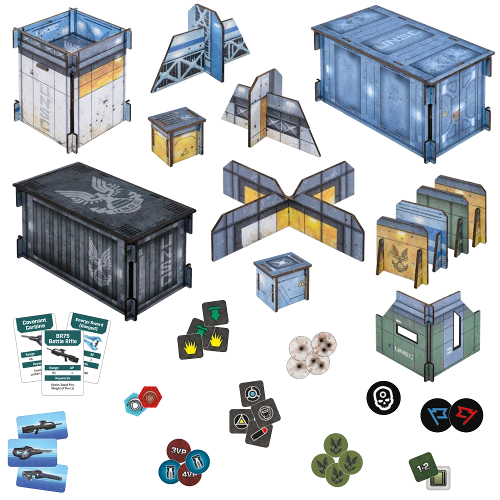 Bring extra terrain to your games of Halo: Flashpoint with the UNSC Base Terrain set, pre-coloured and easy-assembly so you can get playing fast. Also contains 10 weapon pickup cards, and a full token set for your games. An excellent pack for constructing denser map layouts, or for event organisers running multiple game tables at once.