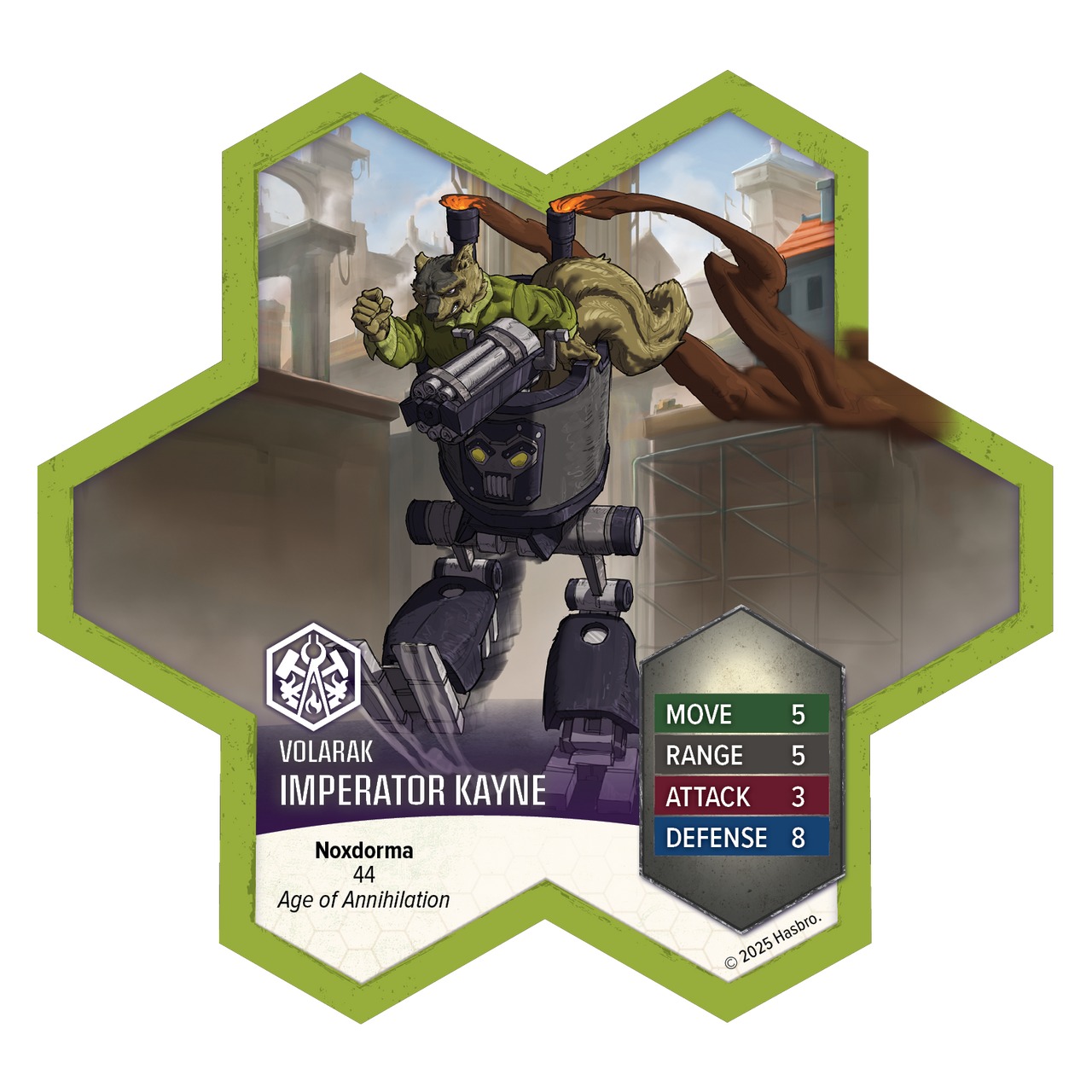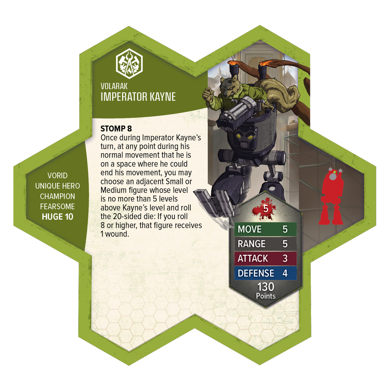 Build your army and make Imperator Kayne the centerpiece of your Volarak faction forces! Kayne thrives in the chaos of combat, targeting enemies on uneven terrain with his devastating stomping power. His ability to punish foes whose level is no more than 5 levels above his makes him a versatile threat across the battlefield. Perfect for players who love high-impact, dynamic gameplay. This expansion contains 1 highly detailed miniature! It is fully compatible with all Heroscape Master Sets and Expansions.