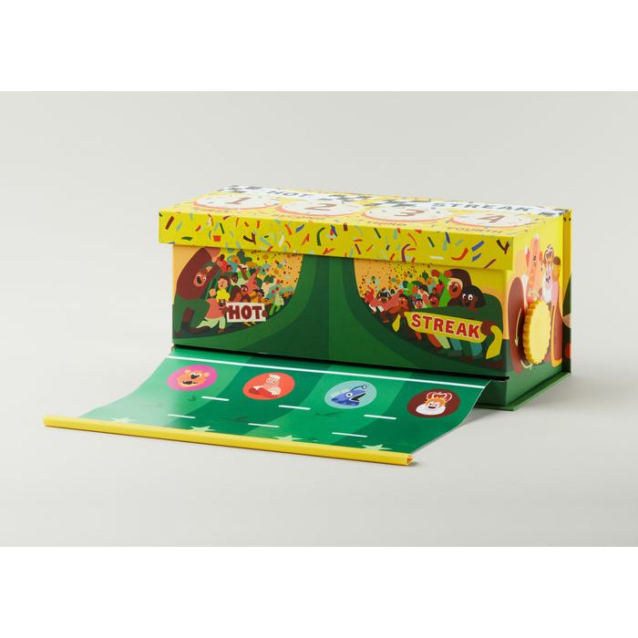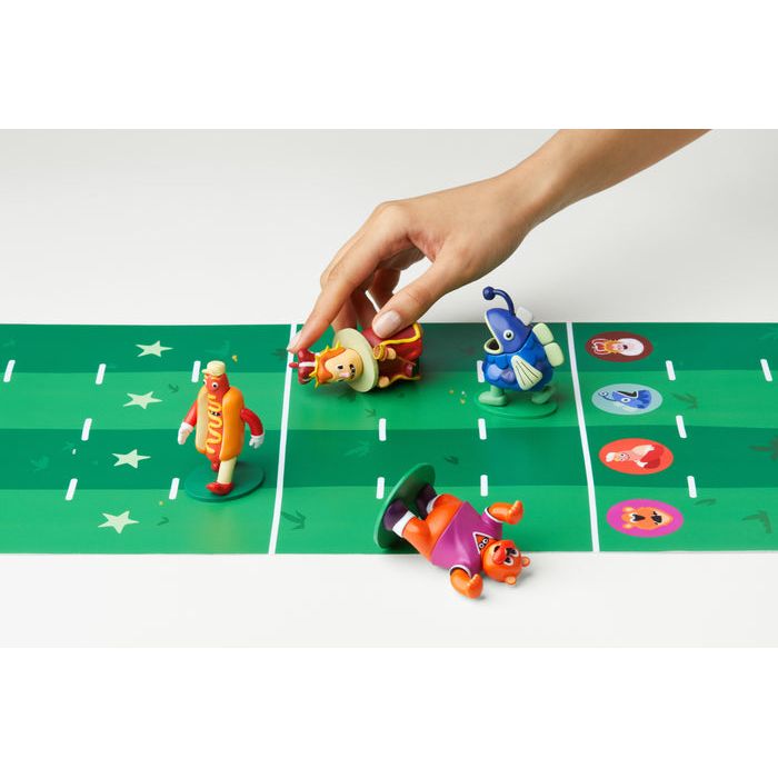 Comes with 4 chunky mascot figures and a ridiculously long pull-out racetrack.