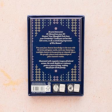 Put your Jane Austen knowledge to the test with a 16pp booklet and 52 trivia and game cards, each one featuring a multiple-choice trivia question, charade, game or challenge about the people, places and relationships of Jane Austen's works.