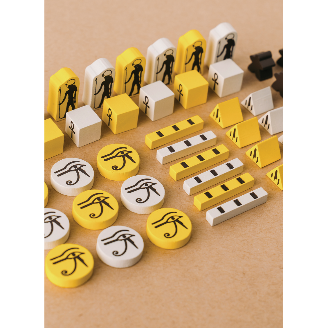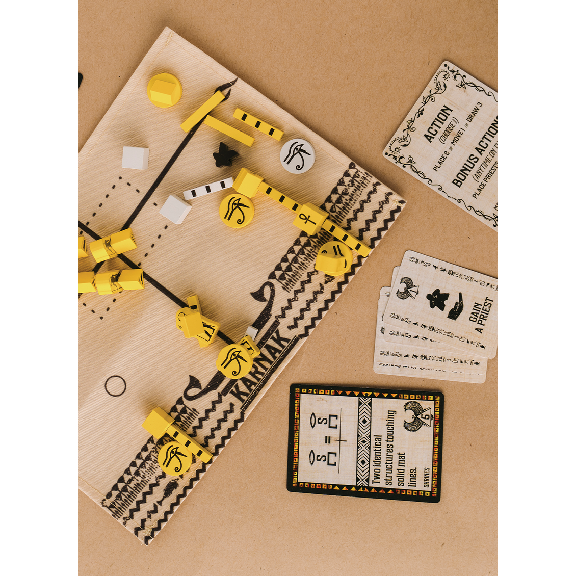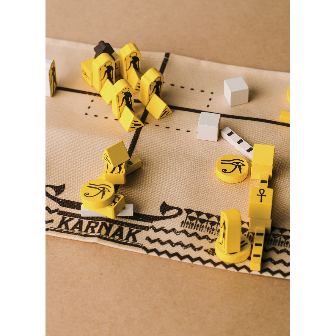 Karnak, the "Most Selected of Places", has been revised by pharaohs and their architects for thousands of years. Here, you are one of those same architects, tasked with various requirements and requests of pharaoh. Score points by taking on pharaoh's demands and placing pieces freely in an organic, creative space. However, your opponents are trying to gain favor of their own, and soon all your competing needs will clash as you meld and transform the desert into a timeless place of holy worship. Add in some tricky methods of moving your opponents pieces and freezing your own in place, and you will be an ancient architect in no time!