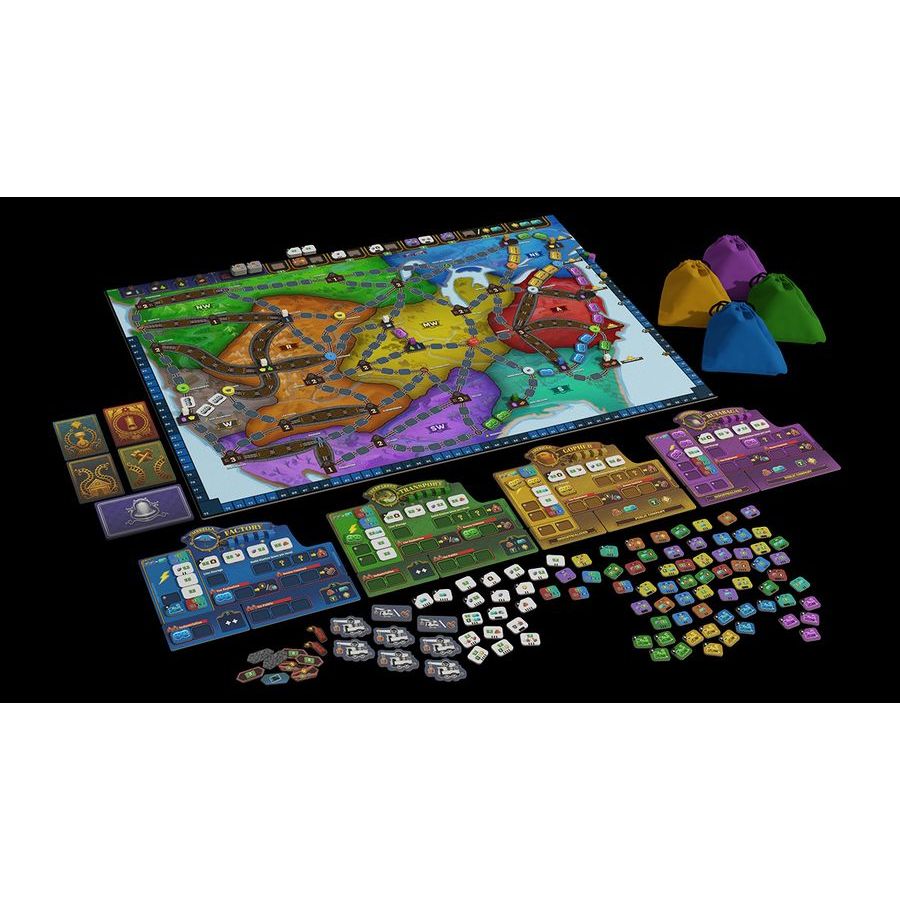 Build your bag to improve your company's resources, then place your chips to open stations and train lines across eight regions of North America. There's a fortune to be made by delivering goods to the cities that need them...but will you work together, or look to cut out the competition? Which stations do you need to secure a route to victory? How can the powerful lightning trains accelerate you past your rivals?