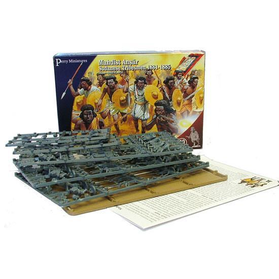 The box contains 40 Mahdist Ansar, who fought the Eygptians and British between 1881-1885. They include command, six flags, info and painting guide, plus sand-colored unit bases. They're designed to be assembled as Beja tribesmen ('Fuzzy Wuzzies', early or late war) or the Kordofan and Nile Arabs, although customers might be able to use them for other Northern African peoples.