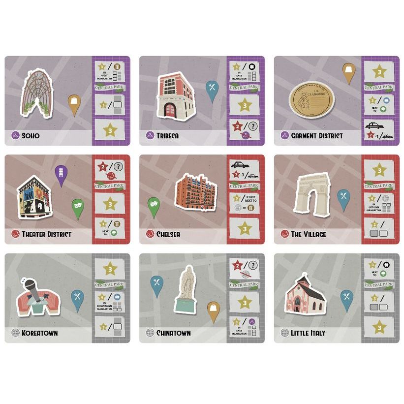 In Making Manhattan, players will take turns drafting cards to add to their tableau outlining their plan for Manhattan. Tableaus consist of Downtown, Midtown, and Uptown areas as well as Central Park. Once both players have completed their plan, players will score points based on the position of each drafted card, personal scoring conditions assigned at start, and how well they managed traffic through the borough. The player with the most points at the end of the game becomes New York’s top city planner and wins the game!