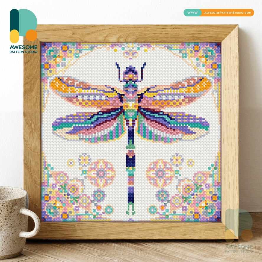 This is for the diamond painting "Mandala Dragonfly". The finished design is a 12"x12" square (120x120 cells), and features 19 colors. Each kit contains all the tools you need to complete this project.