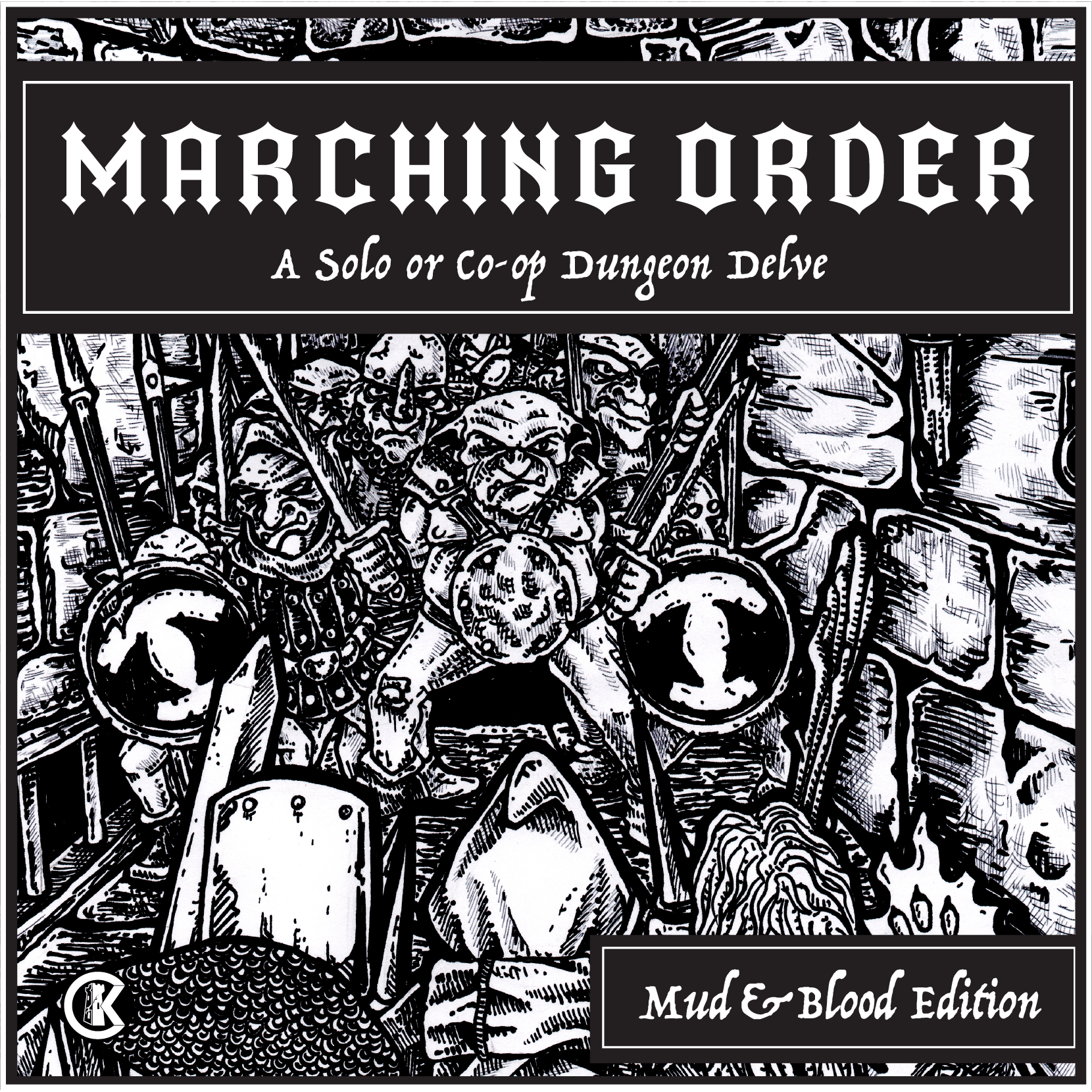 Marching Order is a solo or cooperative dungeon crawling game of greedy Rogues pilfering everything they can from monsters and each other. It comes with the Rogues Handbook, the Delvers Guide, and cards for your Rogues and Monsters.