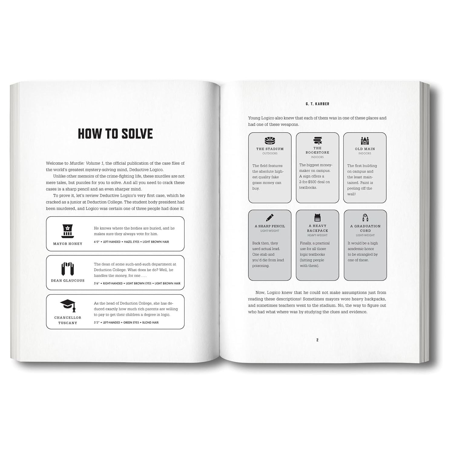 Join Deductive Logico and investigate murders most foul in Murdle: Volume 1. The first of their kind, these humorous mini-mystery puzzles challenge you to find whodunit, how, where, and why. Examine the clues, interview the witnesses, and use the power of deduction to complete the grid and catch the culprit. Together, you’ll uncover a buried secret beneath all of the murders and a message that can only be decrypted when you’ve solved them all.
