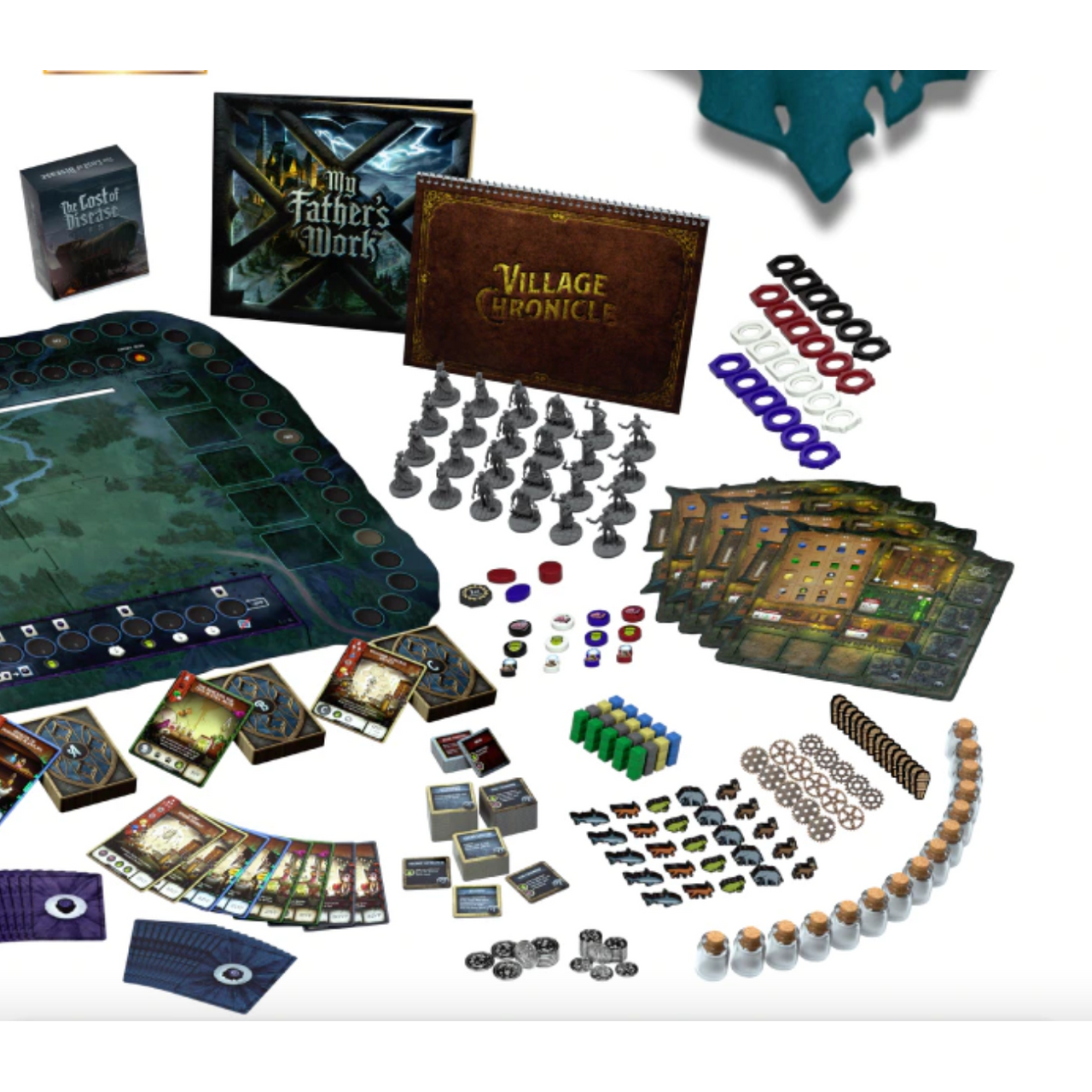 In My Father's Work, players are competing mad scientists entrusted with a page from their father's journal and a large estate in which to perform their devious experiments. Players earn points by completing experiments, aiding the town in its endeavors, upgrading their macabre estates, and hopefully completing their father's masterwork.
